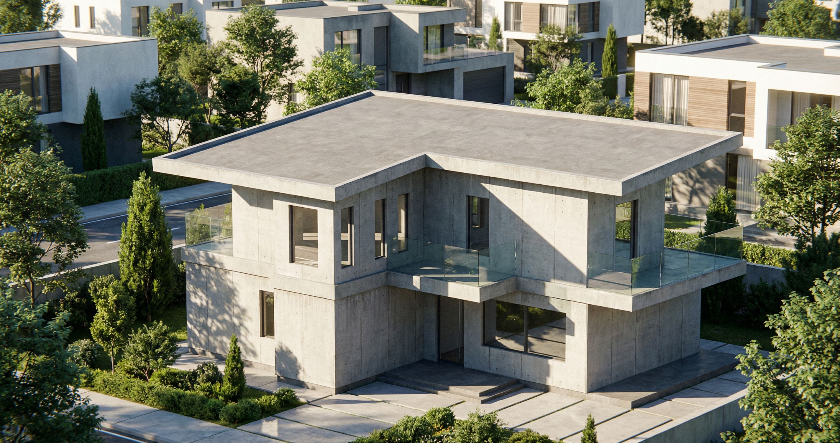 PromptPhoto of a contemporary residential building featuring angular design elements, large glass windows, and a flat roof. Emphasize sleek concrete and glass materials, with a minimalistic balcony. Urban setting includes a modern neighborhood with greenery. Soft, diffused evening light casts long shadows, enhancing textures. Captured from a low angle perspective with a 24mm lens to accentuate the structure's height and surrounding landscape, highlighting architectural details and the contrast between materials., keep exact camera angle