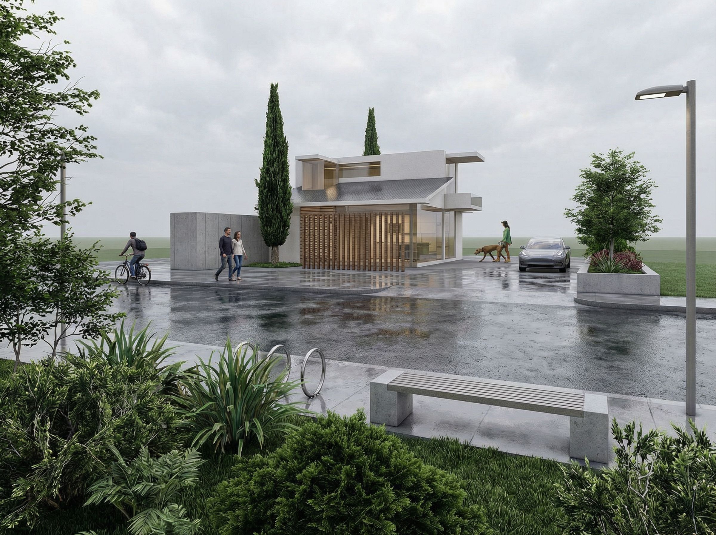 architectural exterior rendering, render this sketch into artistic illustration, contemporary, keep exact camera angle, overcast day with diffused lighting, including people, vehicles, greenery and vegetation, trees, street furniture, high quality, professional, detailed scene