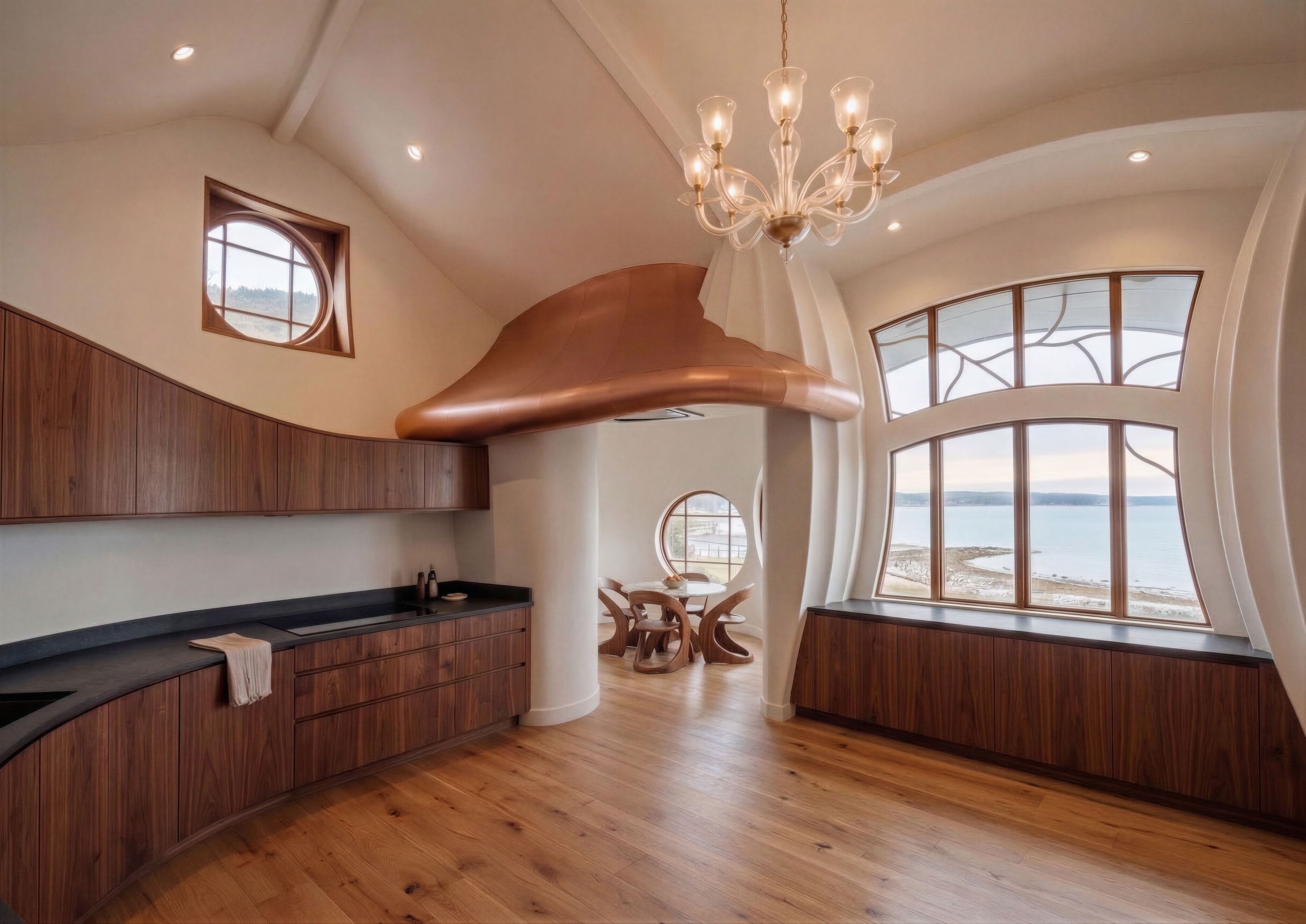 EnhancedPromptmake changes to this image as listed below: delete chair on the left of round window move the current dining set to the room with round window, that's a dining room replace the shelf and books below the big window with base cabinets do not change anything else in the scene Do not change any other items do not add any other items Do not change camera angle Keep the exact camera angle, keep exact camera angle