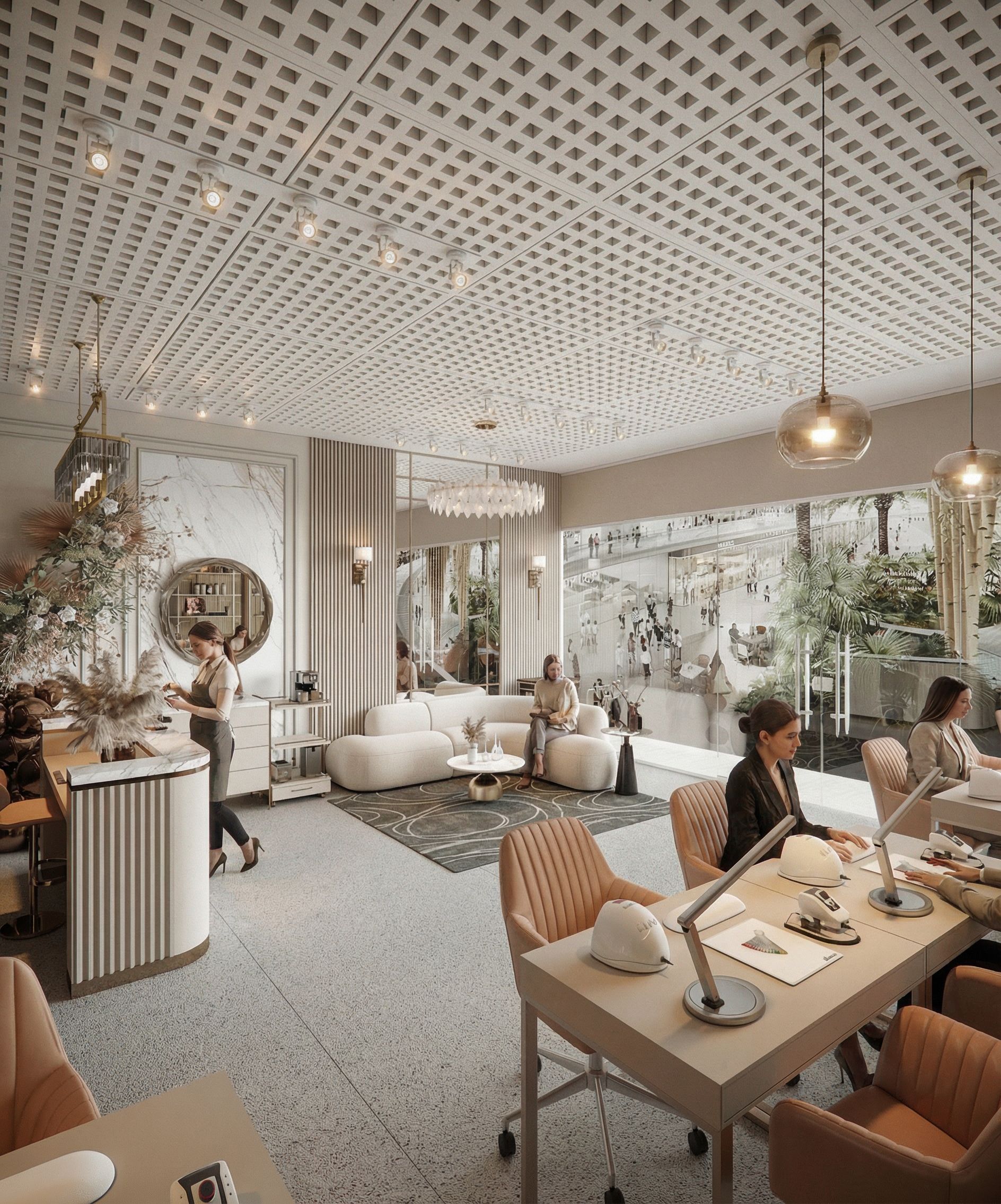 This photograph captures the interior of a modern salon, showcasing subtle architectural elements such as patterned ceilings and minimalist furnishings. The space utilizes soft, neutral tones, comfortable seating, and polished surfaces, complemented by lush greenery visible through large glass windows. Natural light floods the interior, creating gentle shadows and subtle accents. Shot from a wide angle, the composition emphasizes the open space and elegant design features, inviting viewers into a tranquil environment. The camera angle is maintained, preserving the architectural proportions and forms, as well as retaining the original materials, highlighting and depicting the textures as realistically as possible., keep exact camera angle