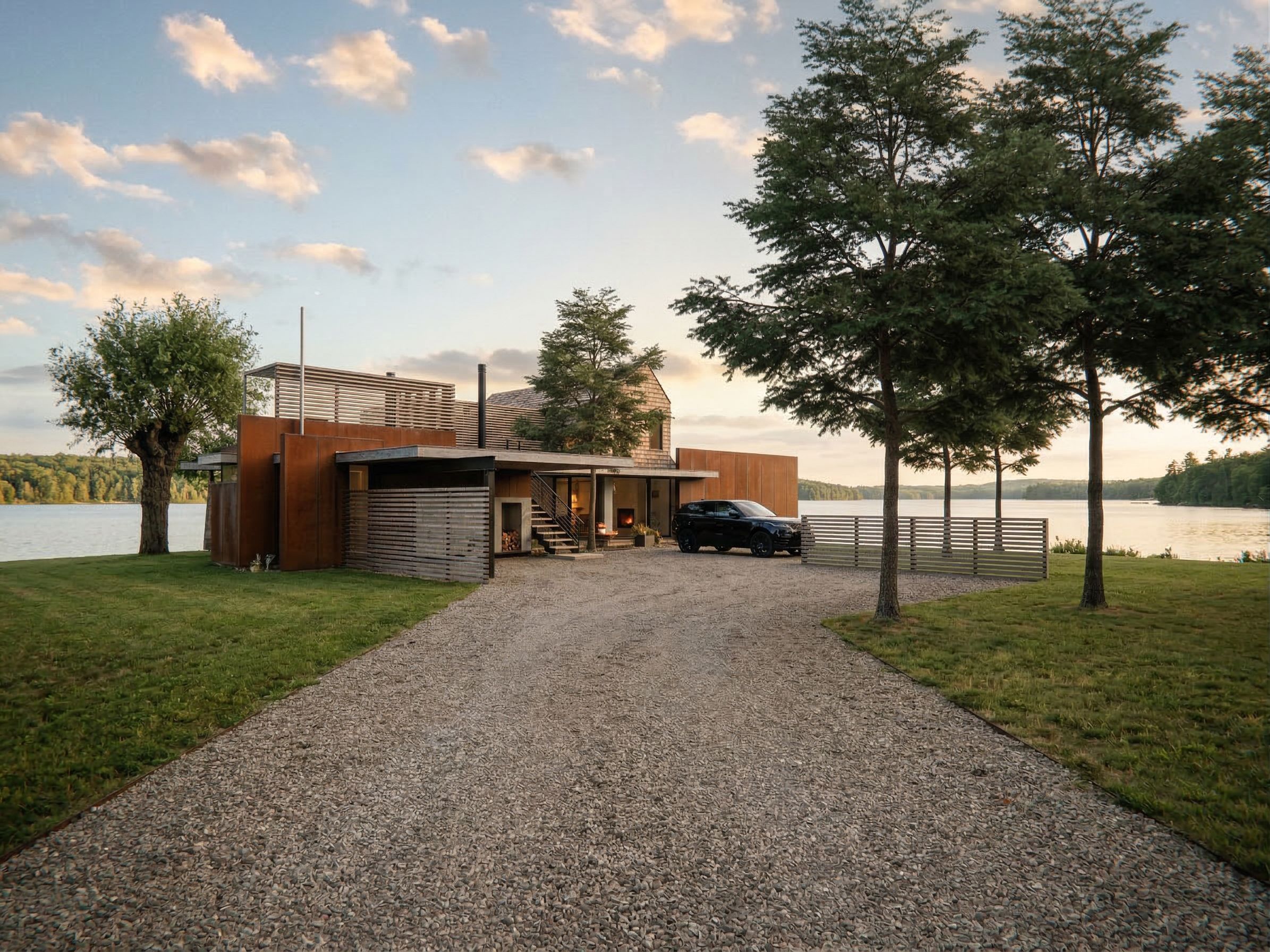 Promptlake cottage with trees in front and lake in back and gravel driveway in line with car as shown, rusted metal siding and wood screen up top with wood shingles to pitched roof beyond follow angle of image as provided, keep exact camera angle