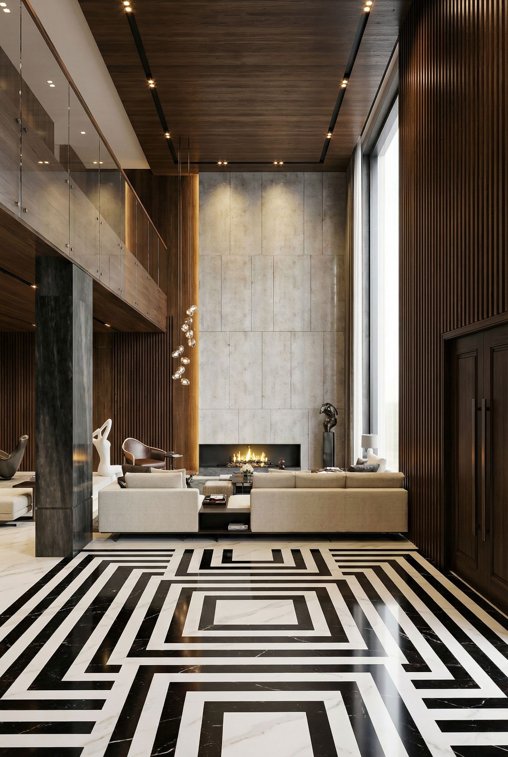 architectural exterior rendering, render this 3D mass into photorealistic rendering, Render a highly realistic ultra-HD interior view of a luxurious double-height living room. Keep the exact camera angle shown—looking toward the tall beige stone wall with large panel divisions, central sofa seating area, and geometric black-and-beige marble floor in the foreground similar to reference image no 3. Show the following EXACT elements from the scene: Architecture & Space Double-height wall with large beige stone cladding panels same proportions as model. Right side full-height vertical wooden slats, dark walnut tone. with wooden double door entrance Infront of the marble pattern Left side darker columns with marble texture. Balcony/bridge above with glass railing and wooden as the refence images spot ceiling lights. Large floor-to-ceiling windows on the right with soft daylight entering. Furniture & Decor Off-white sofas arranged around central area. Low coffee table with accessories. Black-and-white geometric rug exactly as shown. Sculptures and décor pieces in their original positions. Hanging glass bubble pendant lights from double height ceiling. Materials Realistic stone with subtle reflection. Warm walnut wall cladding. Dark polished marble columns. Soft fabric sofas. marble light brown flooring. Lighting Soft natural daylight from the right windows. Warm ambient interior lighting. Balanced highlights + soft shadows. High contrast but clean and elegant. Render Style Ultra-realistic 8K resolution Photographic dynamic range Sharp textures Perfect global illumination Slight cinematic tone No noise High-end luxury interior magazine quality, keep exact camera angle, high quality, professional, detailed scene