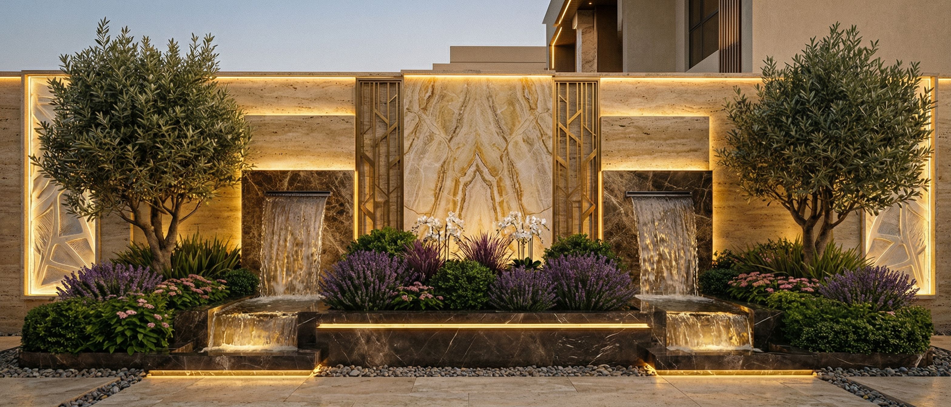 PromptRE DESIGN THIS WALL DESIGN TO BE MAXIMUM LUXURY , WATER FOUNTAINS , SAME FINISHINGS MATERIALS , CREATIVE DESIGN FOR THE WALL , FOR A PRIVATE VILLA , keep exact camera angle