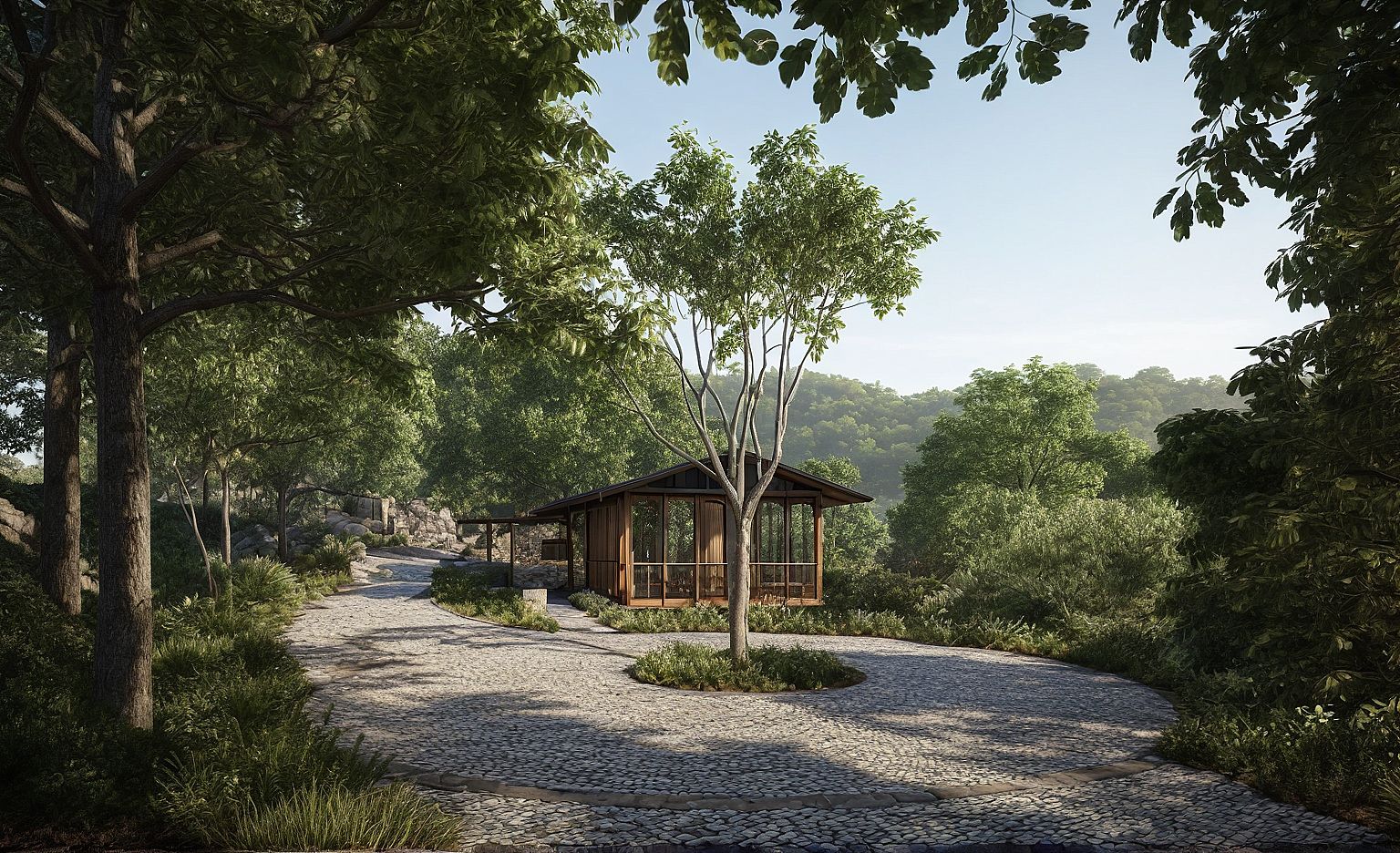Generate a hyper-realistic morning render of a resort arrival pavilion viewed from a curved cobblestone path. Preserve the architectural design, detailing, materials, and finishes exactly as shown. The landscape should feel intentional and well-maintained: lush with orderly planting along the path edges, soft grasses, and a mix of native and decorative foliage. Trees should retain their current density, placement, and species. Light should evoke a calm, welcoming morning atmosphere with long shadows, soft ambient glow, and subtle light filtering through the canopy. focus instead on clarity, realism, and visual warmth that invites the viewer in. more defined cobble stone texture on the floor.
