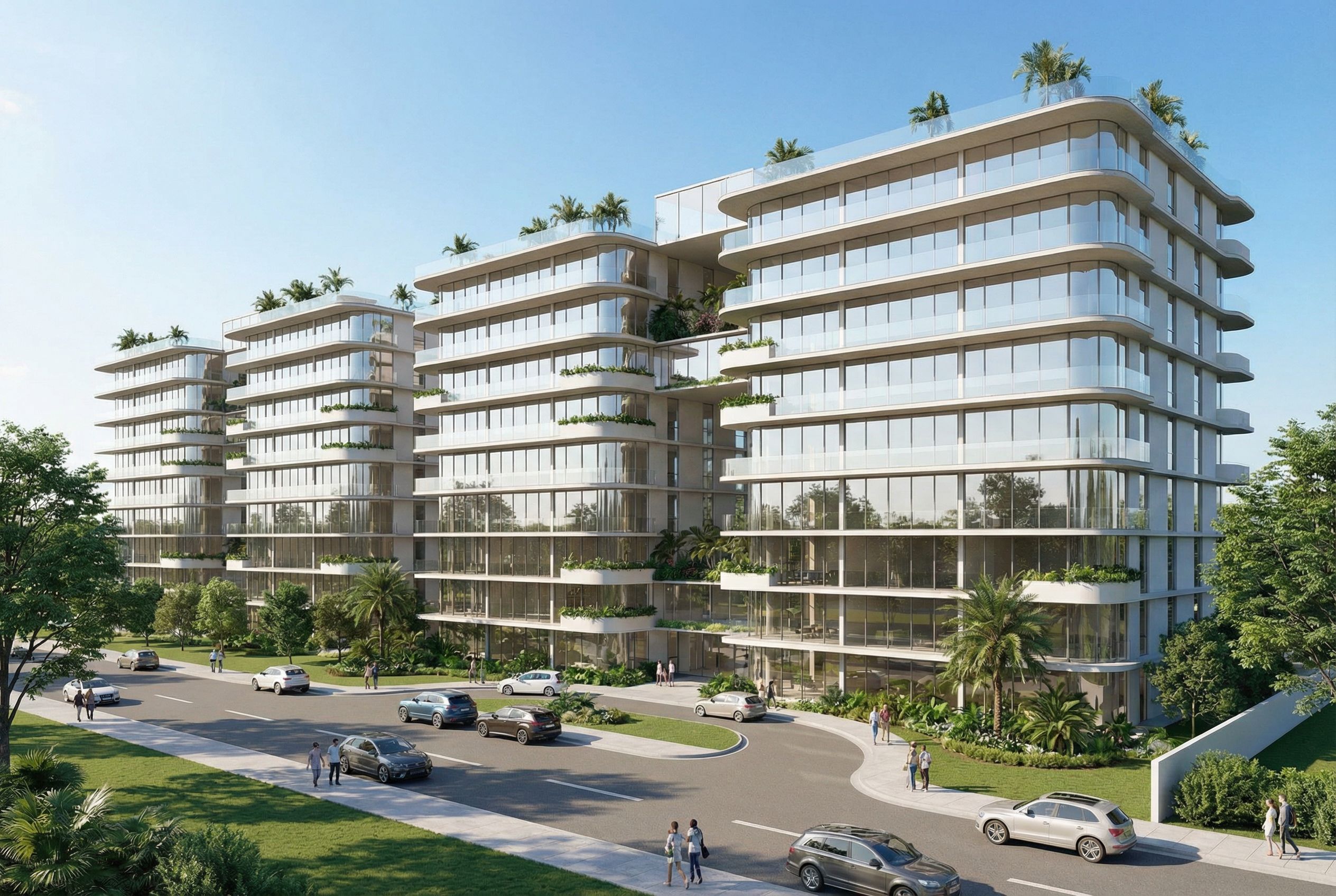 architectural exterior rendering, render this 3D mass into photorealistic rendering, Photo of a modern multi-story residential building featuring sleek glass facades and expansive balconies adorned with greenery. Surrounded by a landscaped urban setting, the structure stands out among nearby contemporary buildings. Bright, natural light highlights the architectural details throughout the day, casting soft shadows. Captured from a low angle, emphasizing the height and layout, with a wide lens to enhance perspective, showcasing the inviting environment and smooth road leading to the entrance., keep exact camera angle, bright daylight, natural lighting, including people, vehicles, greenery and vegetation, trees, high quality, professional, detailed scene