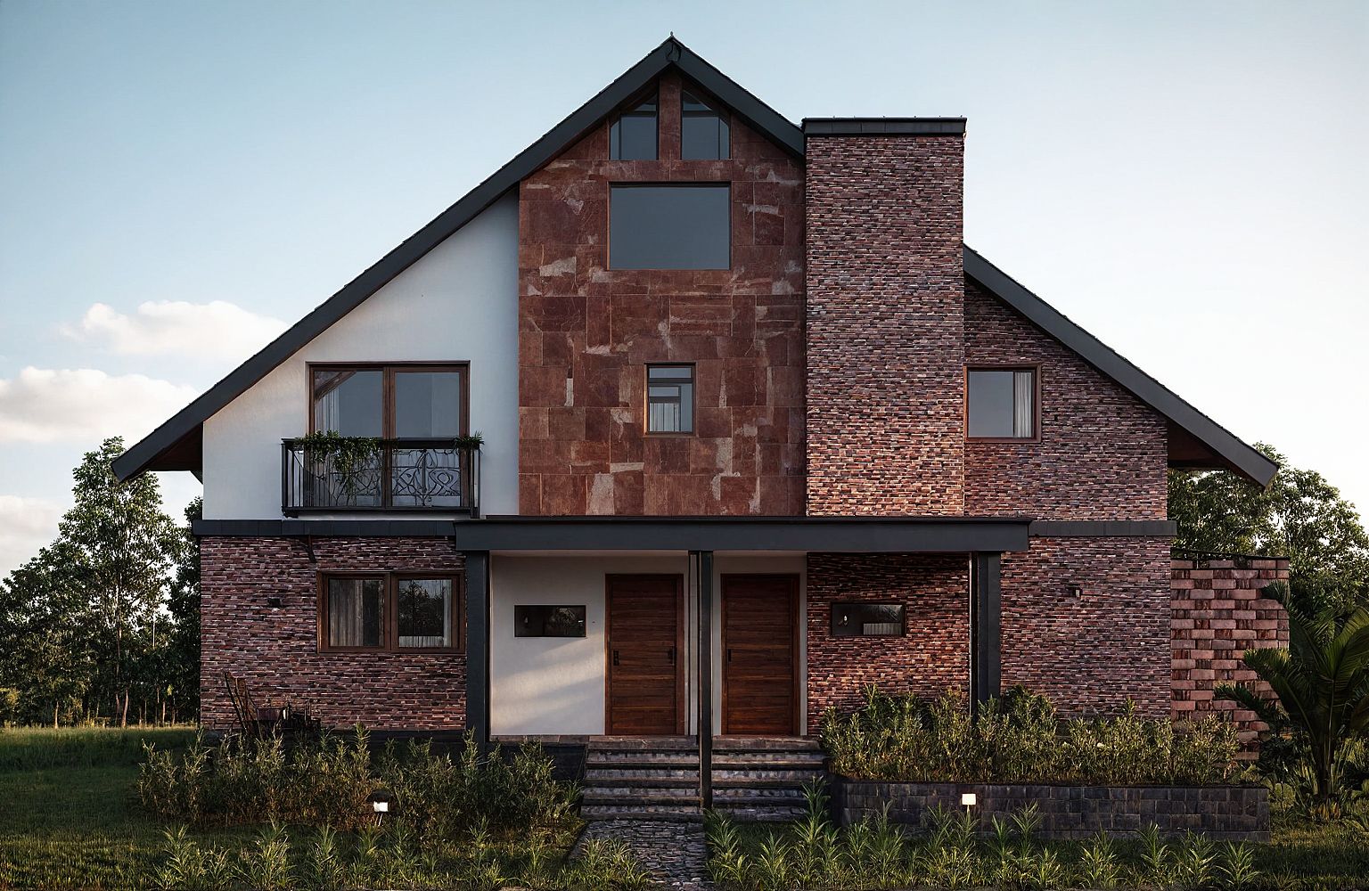 German-style countryside house facade made of bricks in reddish tones, dark wood, metal, and stones in some areas. The house is in the middle of a field in Paraguay.