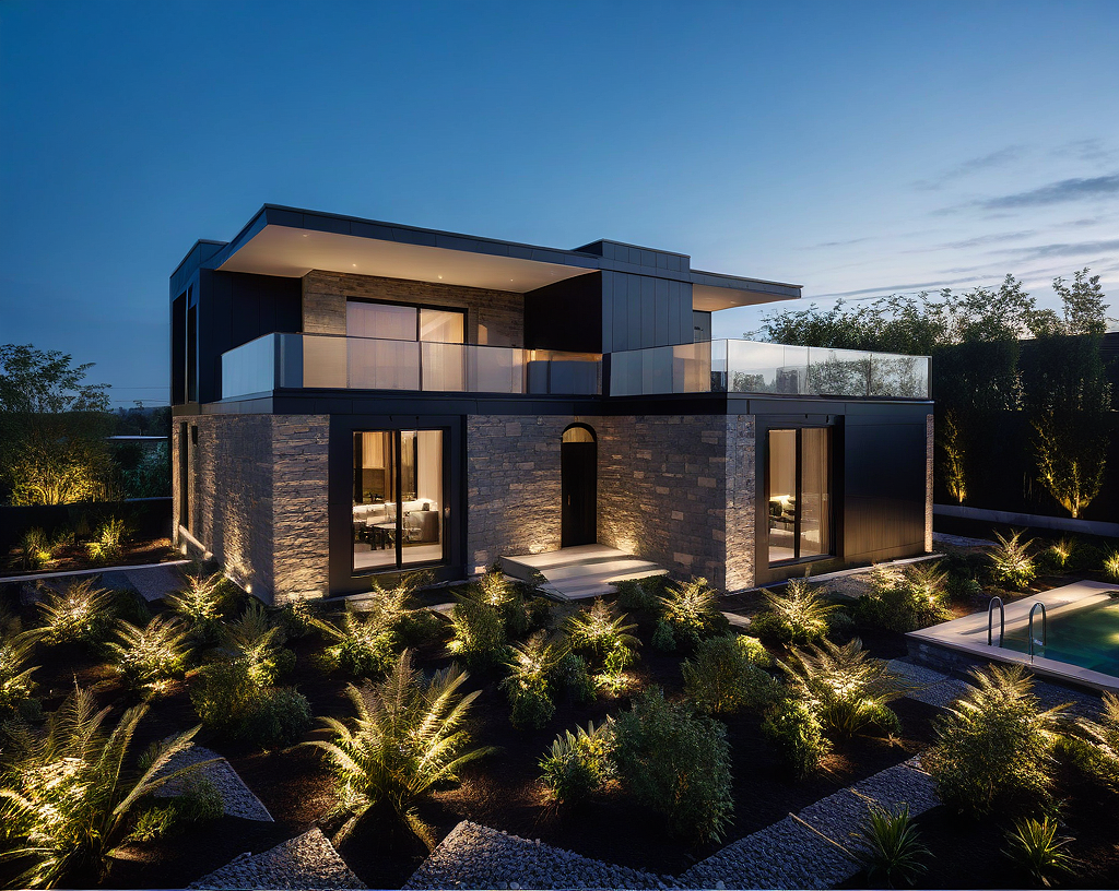 Promptuse black composites and stone on facade do not change windows size , do not change garden border , this is three floor hotel , simple garden , three meter elevation difference on the backside , daytime , black parts are composite