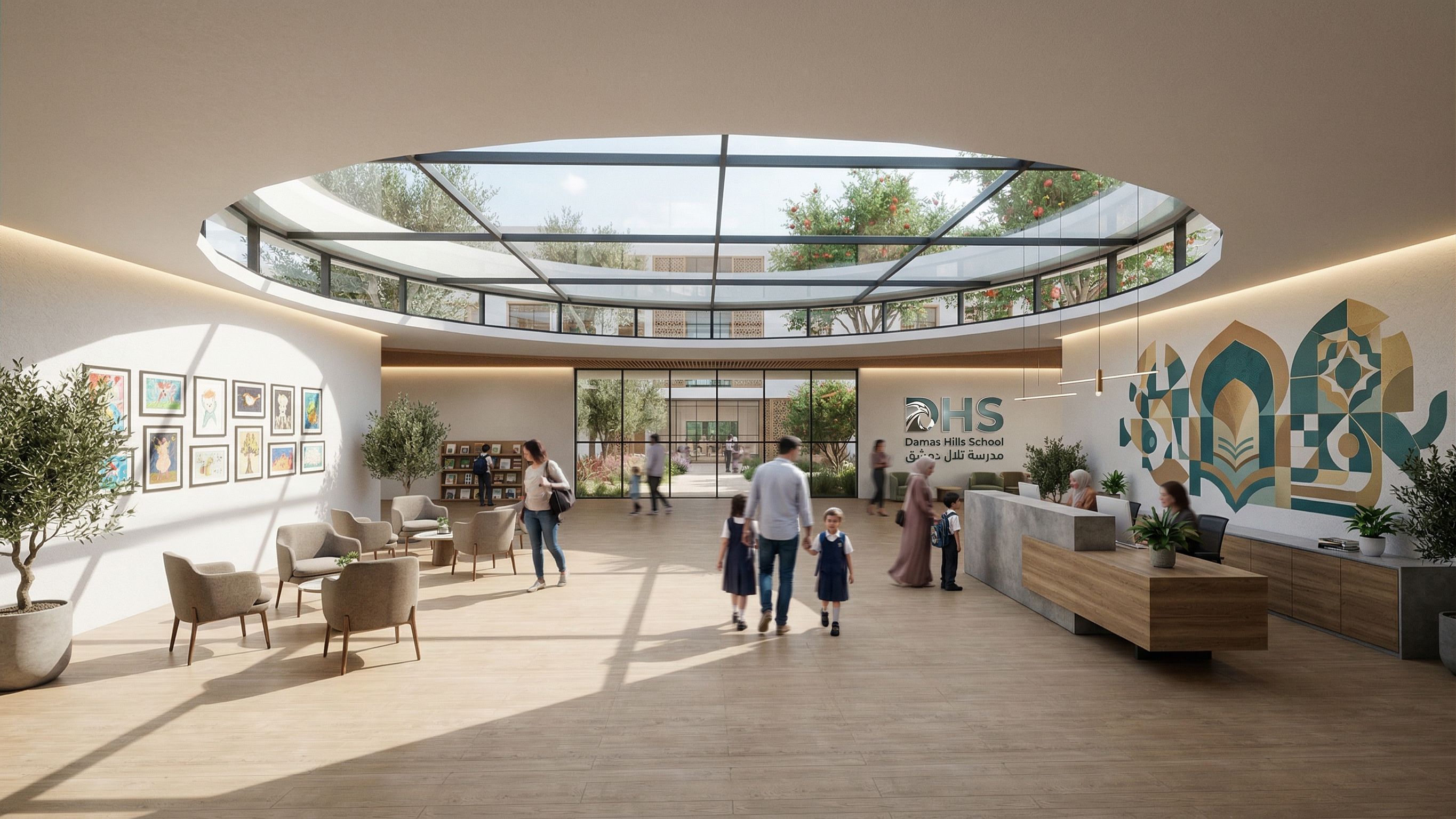 it is the interior 0f a modern Syrian ARAB school and it shows the inner reception area of the school and the main lobby and the logo of the school DHS Damas Hills School مدرسة تلال دمشق
