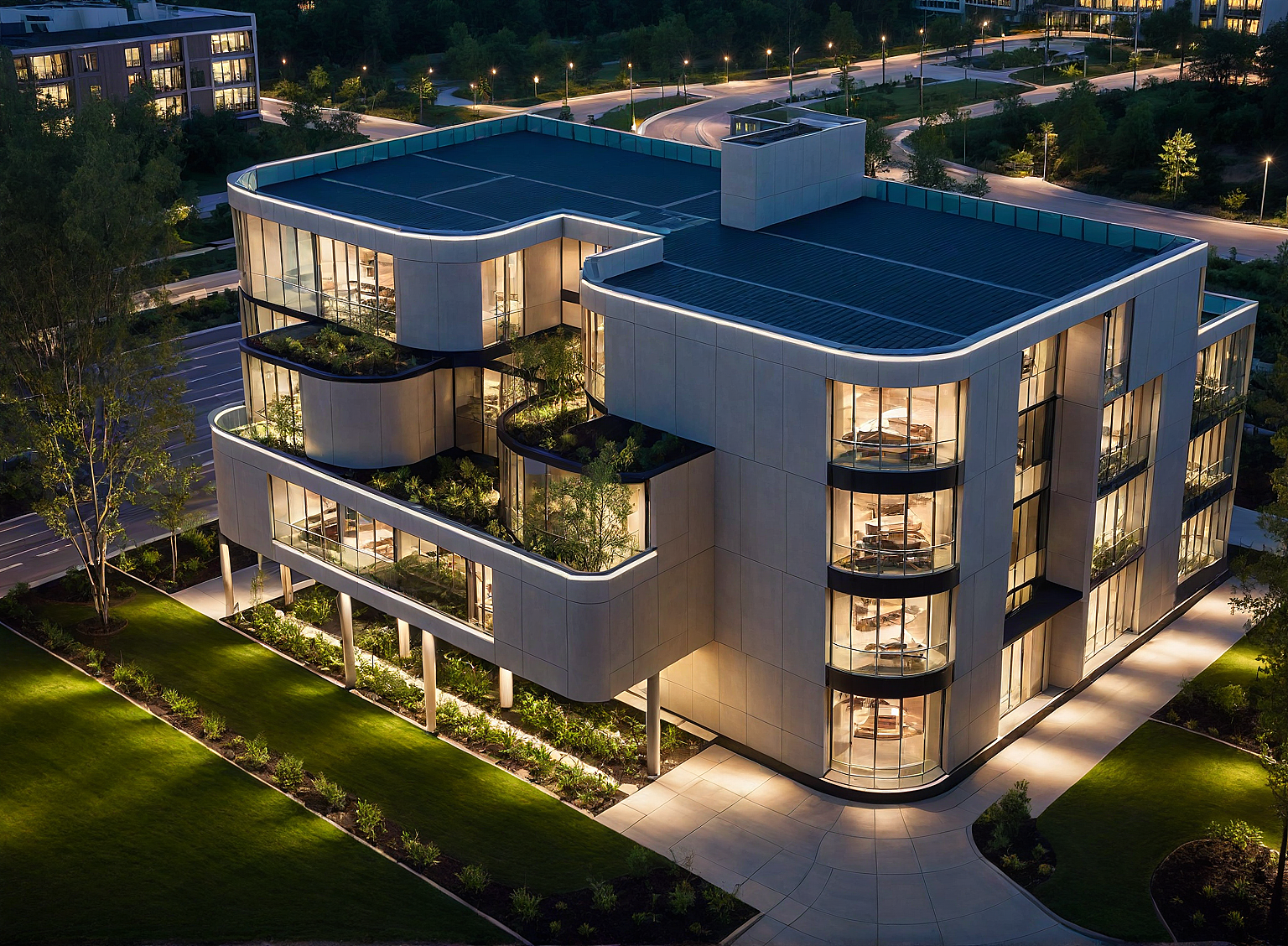 PromptA modern multi-story building with a contemporary architectural design, featuring staggered geometric sections and large floor-to-ceiling windows. The exterior consists of a sleek glass facade combined with beige walls, creating a sophisticated and elegant look. The building has a covered entrance supported by sleek columns, surrounded by landscaped greenery with pathway lighting. The setting is captured during early evening, with soft ambient lighting enhancing the structure’s aesthetic