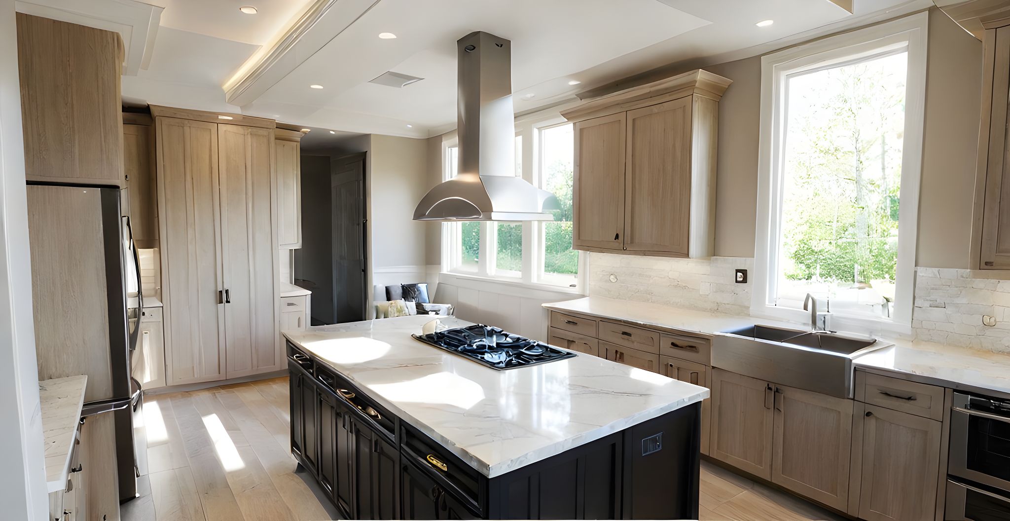 PromptPhoto of a modern kitchen featuring sleek cabinetry and an expansive island. Highlight the white wood textures and polished stone countertops, contrasted with dark accents on knobs and fixtures. The layout emphasizes functionality with natural light streaming through large windows, creating soft shadows. Capture the scene from a slightly elevated angle, focusing on the island's surface and the unique hood above the stove. Use a wide-angle lens to convey spaciousness and a warm, inviting atmosphere.