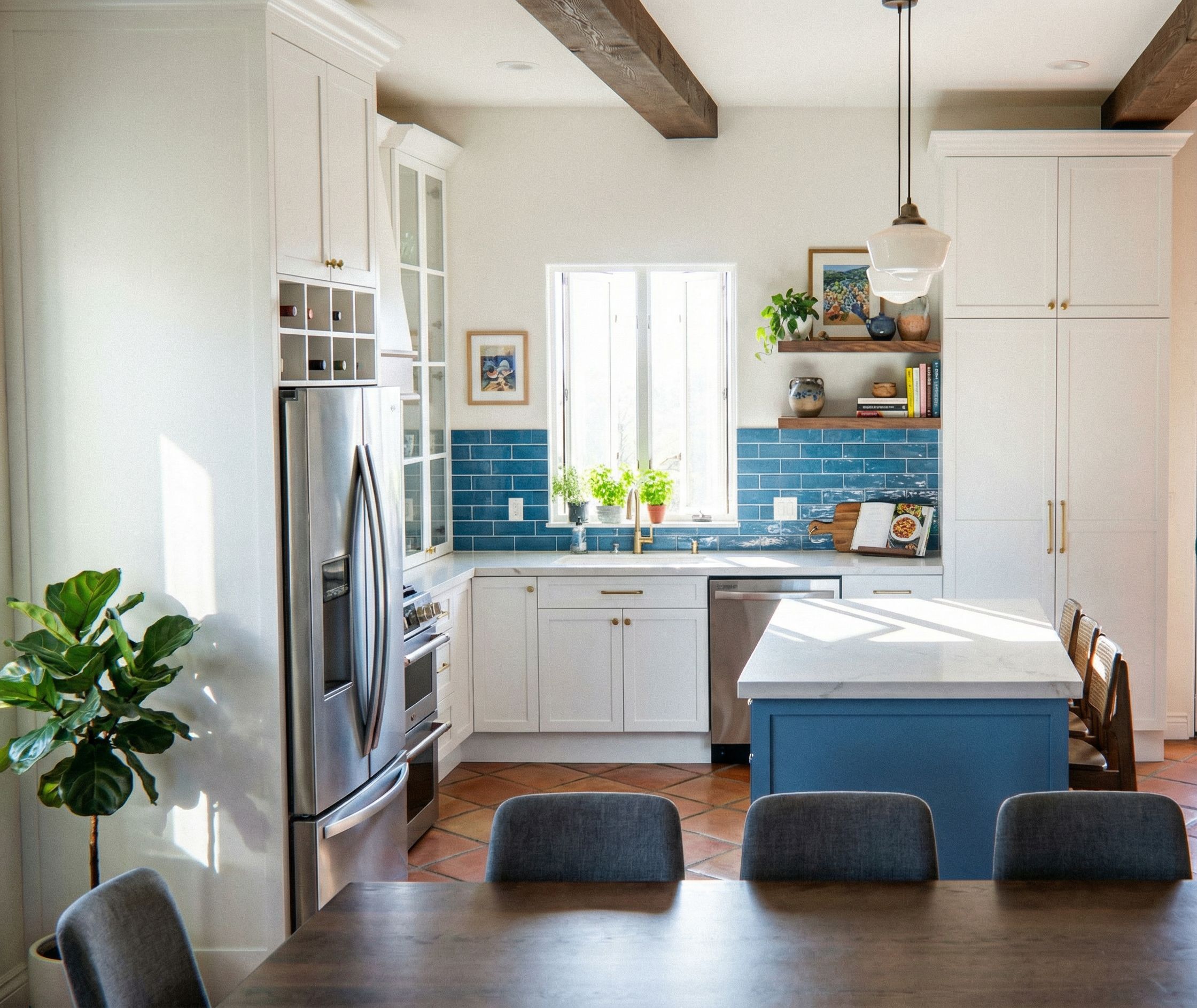 PromptAll white kitchen, blue island, blue subway tile back splash, knobs above on upper cabinets, handles on lower cabinets, no under cabinet lighting, full exposed sun, bright as can be, , keep exact camera angle