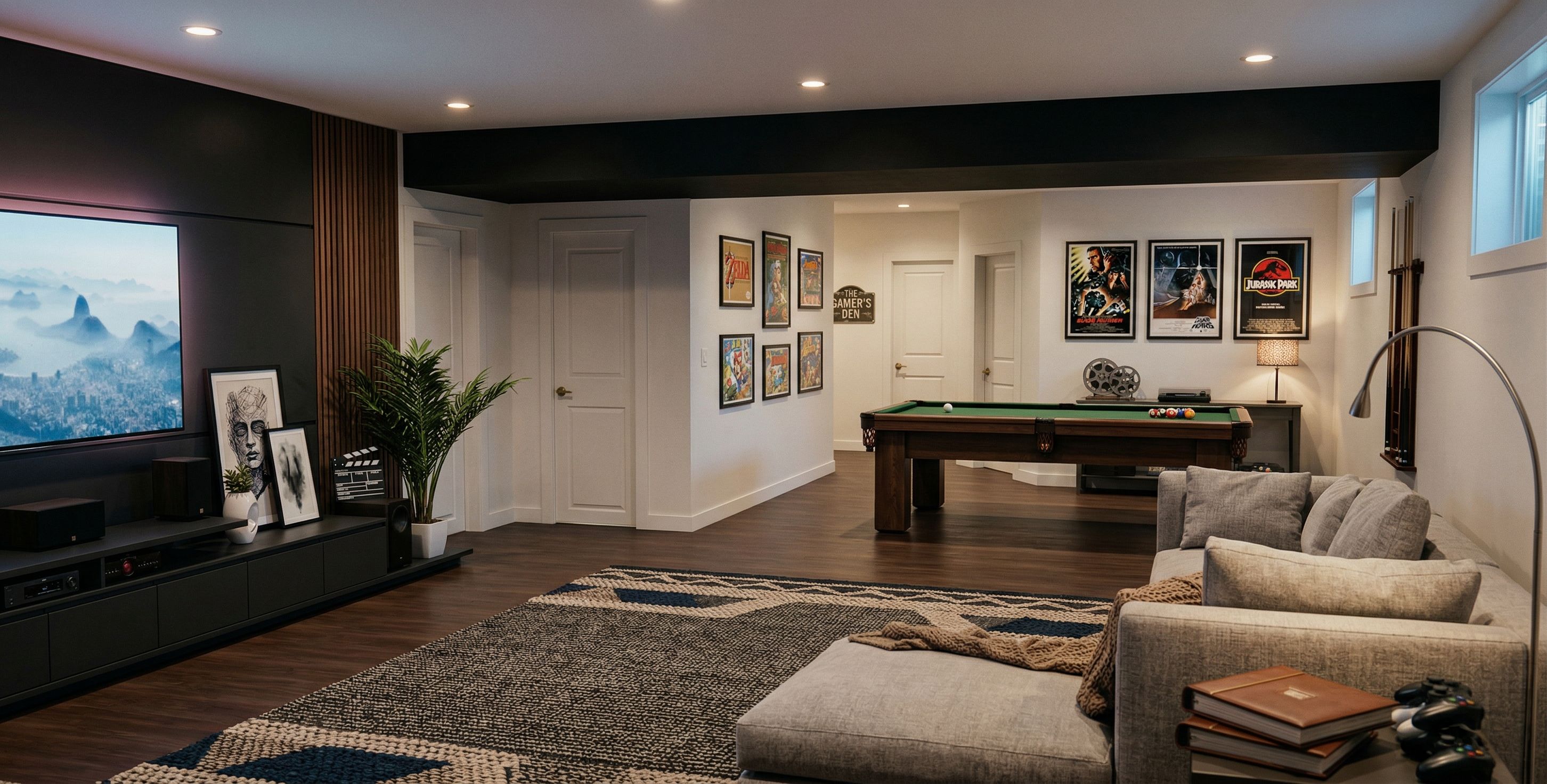 PromptFun basement area, games and movie themed, black bulkead with no lights, pot lights in white ceiling areas, decorate and add wall art and rugs, keep exact camera angle