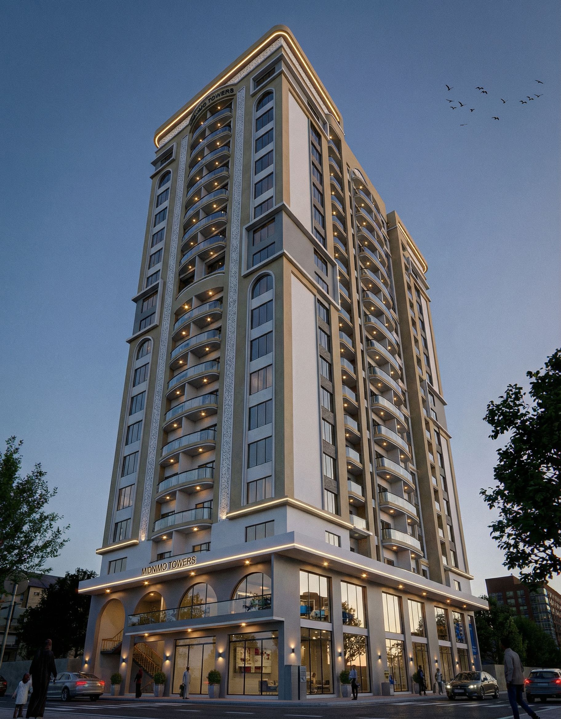 EXTERIOR IMAGE OF A BUILDING WITH GROUND FLOOR AND FIRST FLOOR AS COMMERCIAL FLOORS AND 2ND -20TH FLOORS APARTMENTS. MAKE THE GLASS REALISTIC, CLEAR AND REFLECTIVE. INCLUDE SOME SPOT LIGHTS AND ROPE LIGHTS, STREET LIGHTS IN THE BUILDING. INCLUDE SOME BIRDS IN THE SKY. INCLUDE SOME PEOPLE OF SOMALI ORIGIN IN THE IMAGE. USE WHITE AND PASTEL BROWN COLOUR ON THE BUILDING. PUT THE NAME " MIDNIMO TOWERS" ON THE BUILDING. INCLUDE MOULDINGS ON OPENINGS, WINDOWS AND ARCHES IN THE BUILDING. USE WHITE WALL MASTER AND PASTEL GREY ON THE BUILDING. REDUCE THE SIZE OF THE WRITING "MIDNIMO TOWERS" AND WRITE IT ALSO AT THE CURVED PART OF THE ROOF ON THE BUILDING FACADE. REPLACE THE BROWN WITH A LIGHTER PASTEL GREY COLOUR. MAINTAIN CAMERA ANGLE FROM ORIGINAL IMAGE.LET THE CAMERA ANGLE BE DIRECTLY BELOW THE BUILDING FACING UP TO THE ROOF TOP. USE THE COLOUR SCHEME IN THE ATTACHED REFERENCE IMAGE. INCLUDE PEOPLE OF SOMALI ORIGIN IN THE PICTURE., keep exact camera angle