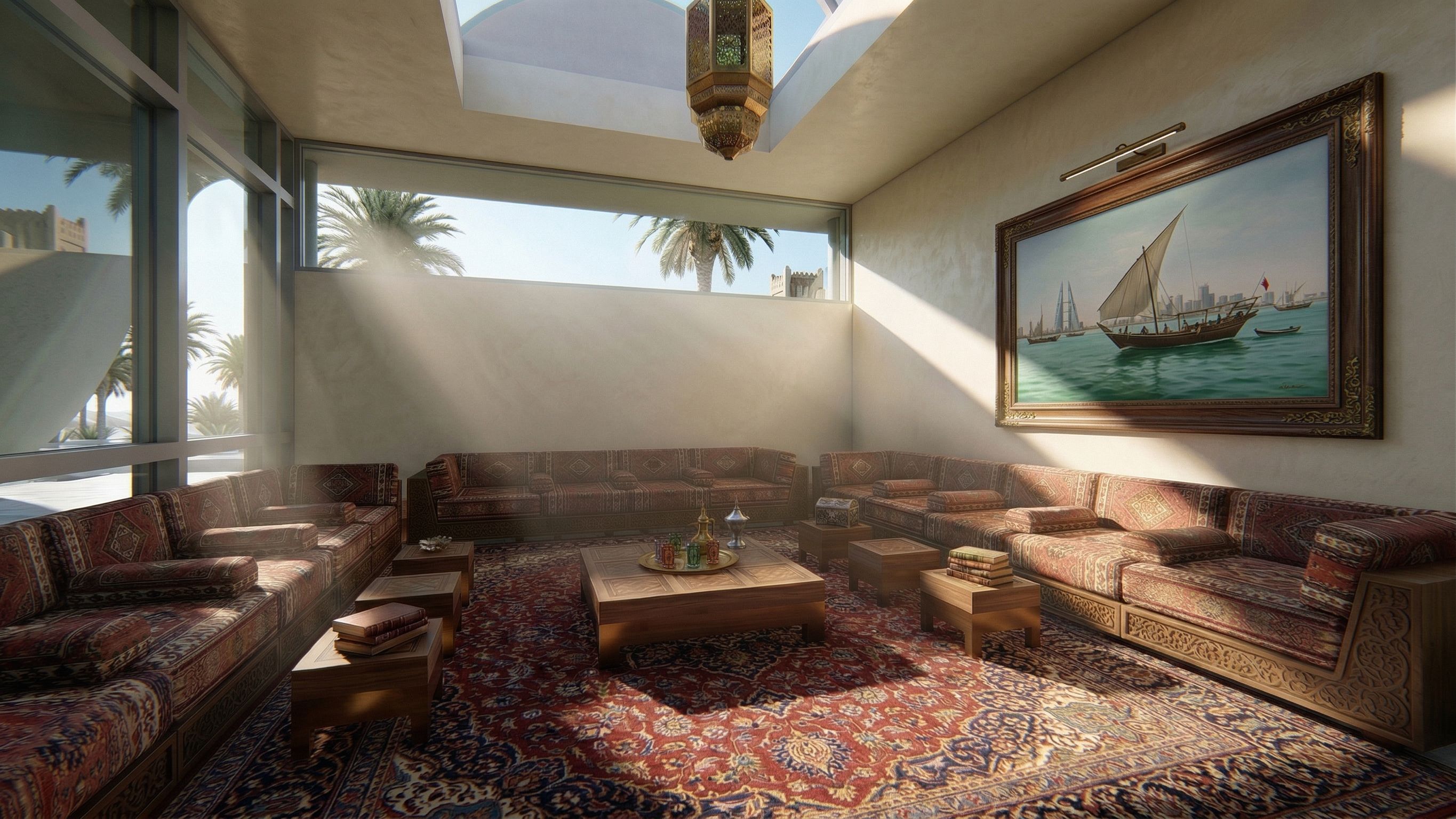 Promptadd a Bahrain fishing boat painting to the right wall, keep exact camera angle