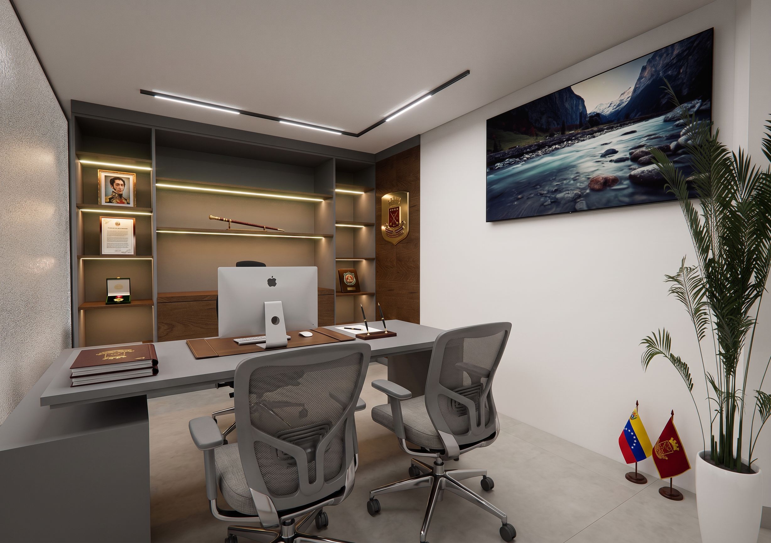 PromptAÑADE DECORACION ES LA OFICINA DEL COMANDANTE DE LA GUARDIA NACIONAL BOLIVARIANA DE VENEZUELA, CAMBIA LAS SILLAS POR SILLAS DE ESCRITORIO COLOR GRIS, NO PUEDES MODIFICAR EL COLOR DEL PISO NI AÑADIR MAS NADA , keep exact camera angle