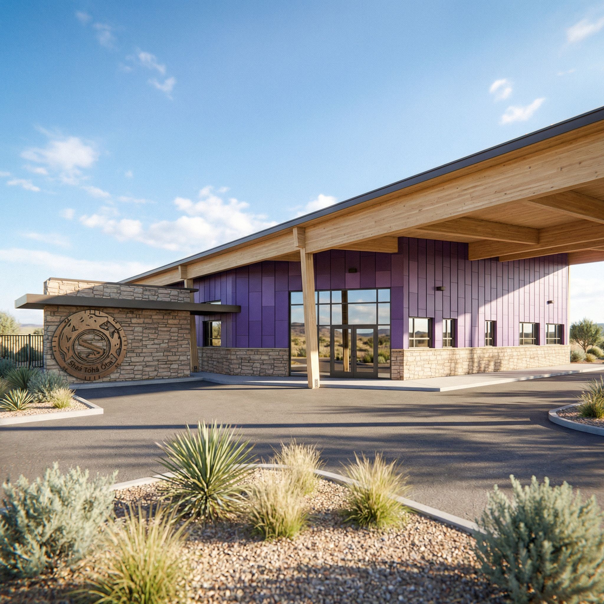 PromptEnhance this architectural render to appear highly photorealistic while maintaining the exact design, geometry, materials, and composition of the original image. Improve lighting realism, material textures, reflections, shadows, and global illumination. Add subtle imperfections such as natural material variation, slight surface wear, realistic glass reflections, and atmospheric depth. Improve sky, vegetation, and environmental lighting to match a professional architectural photograph. Preserve all architectural elements exactly as shown. Use physically accurate lighting, soft shadows, realistic depth of field, and high dynamic range. Ultra-high resolution, photorealistic architectural photography style. Landscape and groundcover should match those native to northern arizona., keep exact camera angle