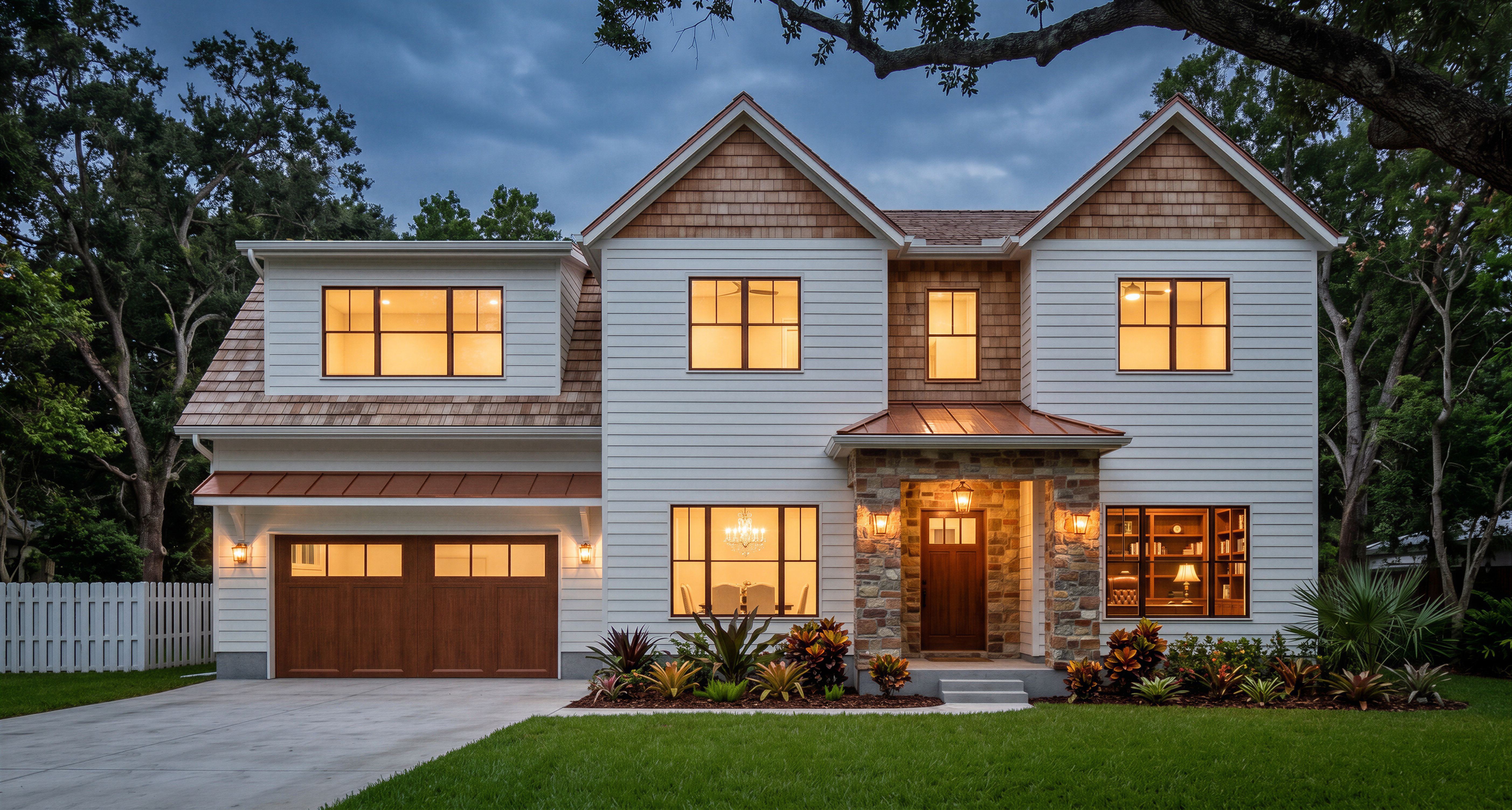 Make photorealistic renderings of this house image; Grass in the front, light brown ground areas flanking the porch entry are flower beds, make flower beds typical for Florida; Trees on the left and right of the house in the background, deciduous tree types typical for Florida; Add exterior light fixtures where appropriate, exterior light is on; Lights on in the interiors; Room to the right of the front porch is office, enhance the look, but keep the existing; Room to the left of the front porch is dining, enhance the look, but keep the existing; Room above the garage leave empty, but lights on; Two rooms with gable roof leave empty, but light on; Room directly above the porch entry leave empty, but lights on; Morph the image from the Reference Image 1 as a background behind the house, keep exact camera angle
