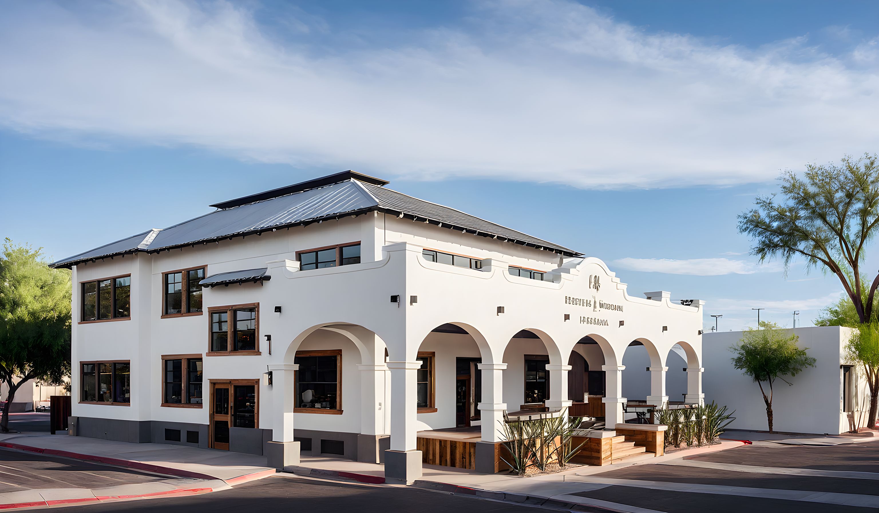 PromptModern restaurant in downtown Phoenix, Arizona, historical neighborhood, white plaster, metal roof, wood accent
