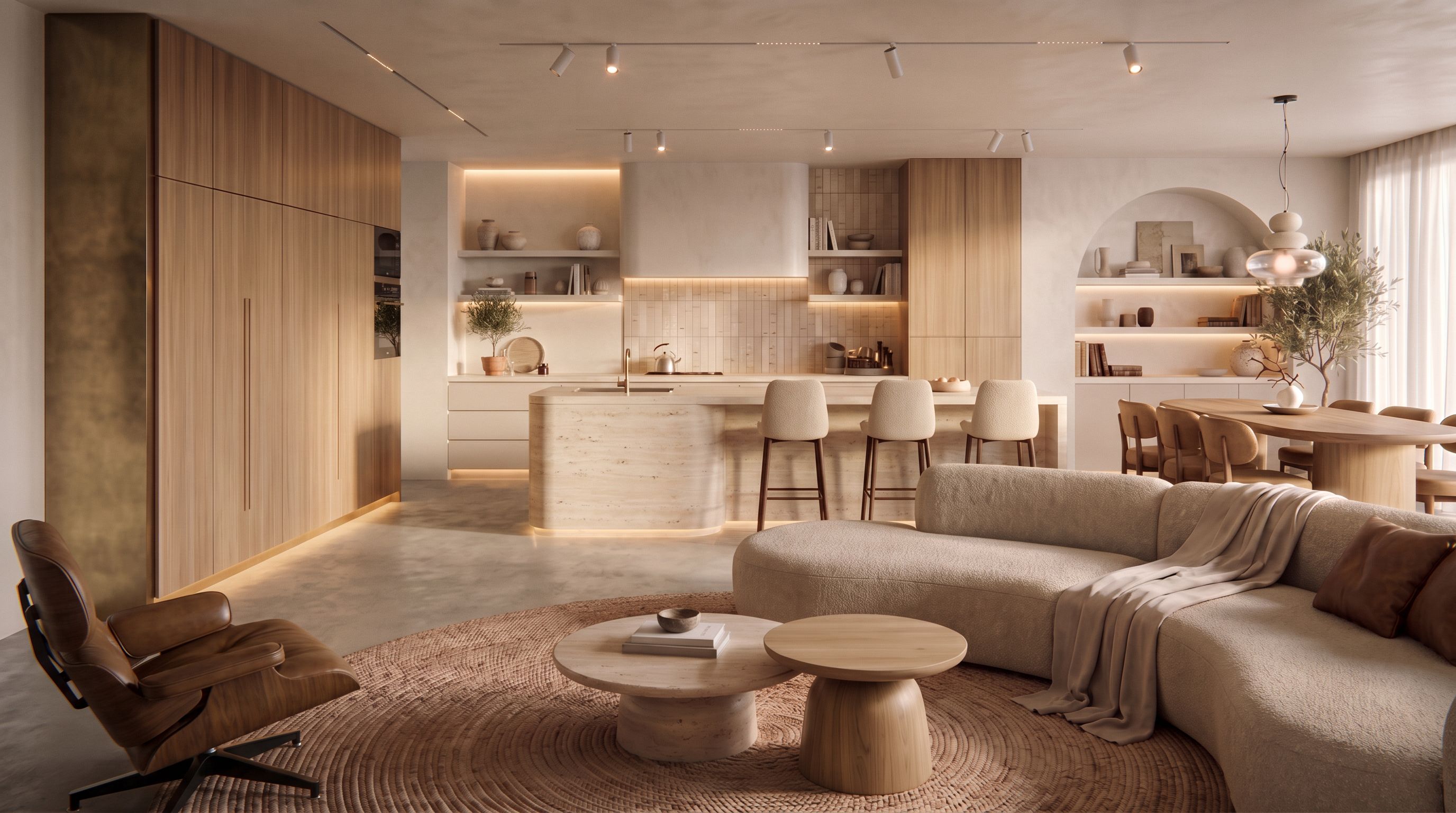 Prompt- Put 3 chairs in kitchen bar like reference image 1. - Sofa is U shaped this is the right side of reference image 1. - Dining table and chairs must have the same material as reference image 1. - Remove the strips in the curved cabinet make it like reference image 1. - Remove the oven make the whole cabinet wood material like reference image 1. - The left side of the kitchen has 2 shelves left side the white drawers in the left side of the scene like reference image 1. - Do Not Rotate or redesign anything put the same model plz in the picture., keep exact camera angle