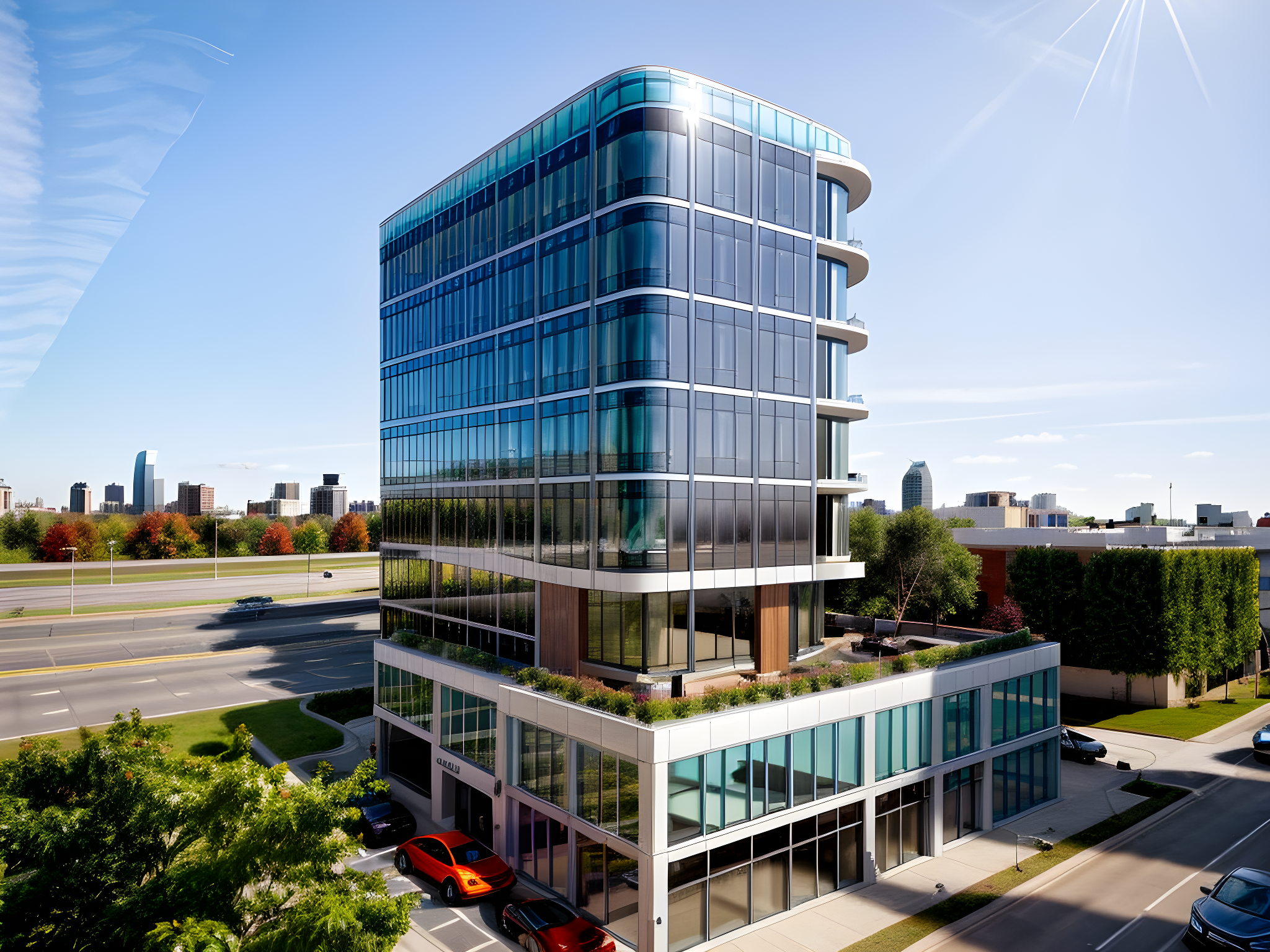 PromptFuturistic Contemporary Structural glazing on a commercial office building with curved glass on all sides. Add a modern city with glass buildings in the background, daylight sun view, trees, people and cars on the street, corner building with roads on both sides, indian cars driving on the street, people walking on the sidewalk, dense foliage and trees along the street