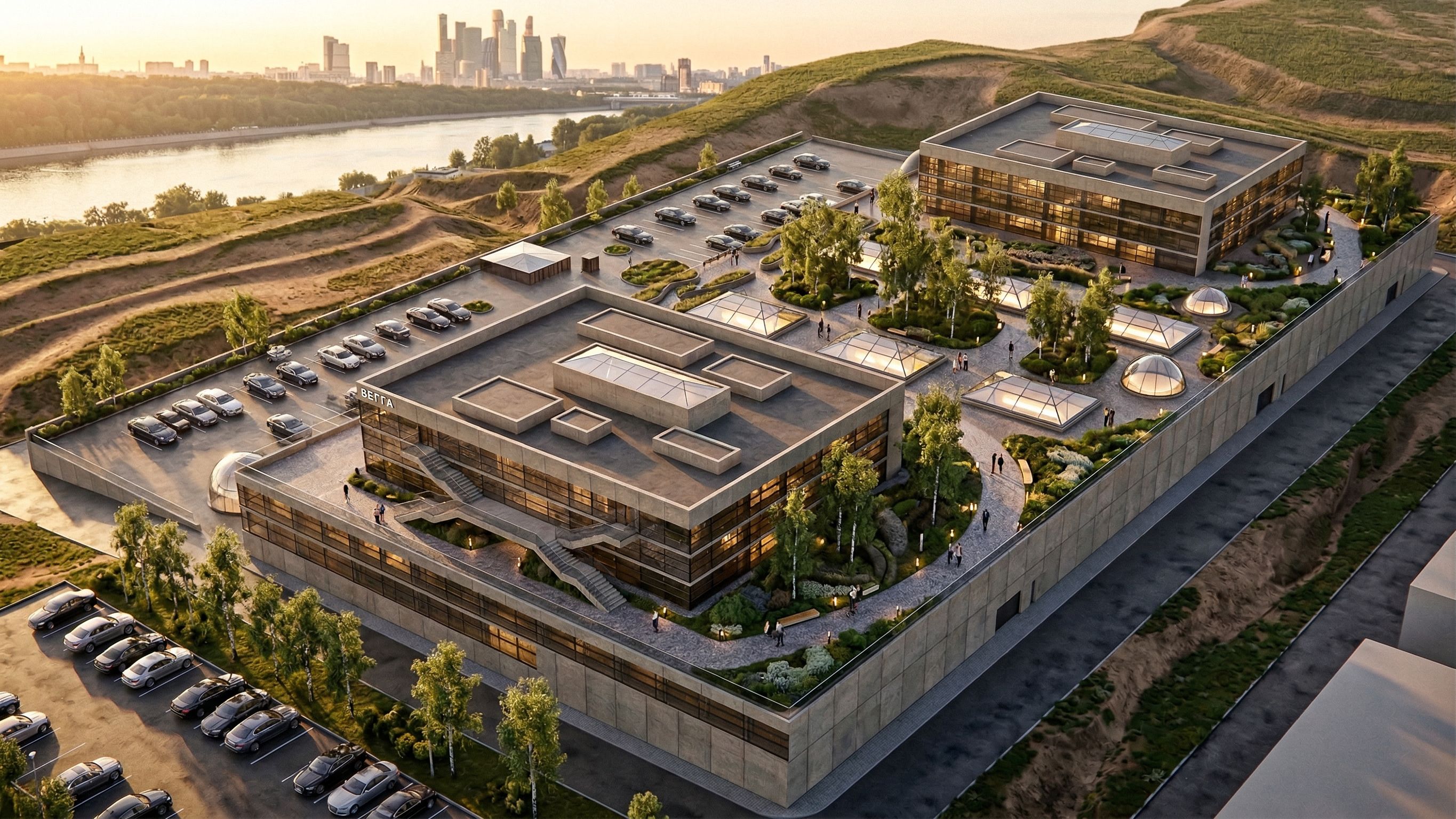 PromptA photograph of a modern industrial and office complex in Moscow, featuring elegant tinted glass facades and innovative landscaping. The project features a multi-level layout and green terraces. Tinted glass skylights on the roof provide natural light. The building is surrounded by a spacious parking lot and several birch trees. People leisurely walk to work. Business-class cars are parked in the open-air parking lot. Warm lighting during the "golden hour" casts soft shadows, enhancing the texture of the materials and highlighting the building's lines. The image was taken from above with a wide-angle lens, emphasizing the overall layout and integration with the surrounding environment. Keep the camera angle sharp., keep exact camera angle