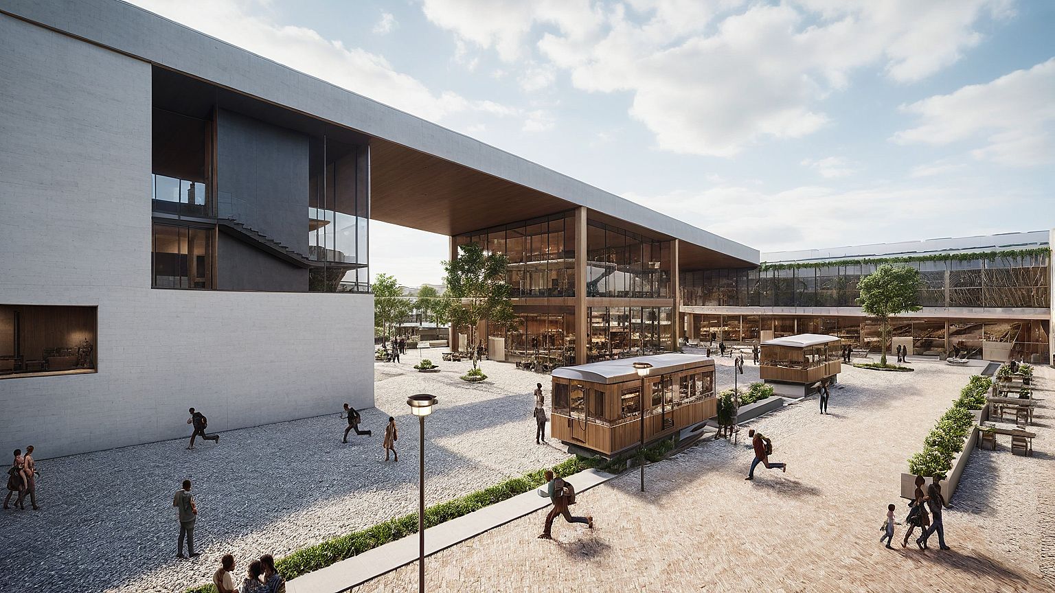 daytime social district proposal Turn on indoor lights for warmth. Add realistic vegetation and people where appropriate. Emphasize the materials with accurate textures and reflections. Improve lighting, shadows, and overall atmosphere for a vivid, lively, and cohesive look.