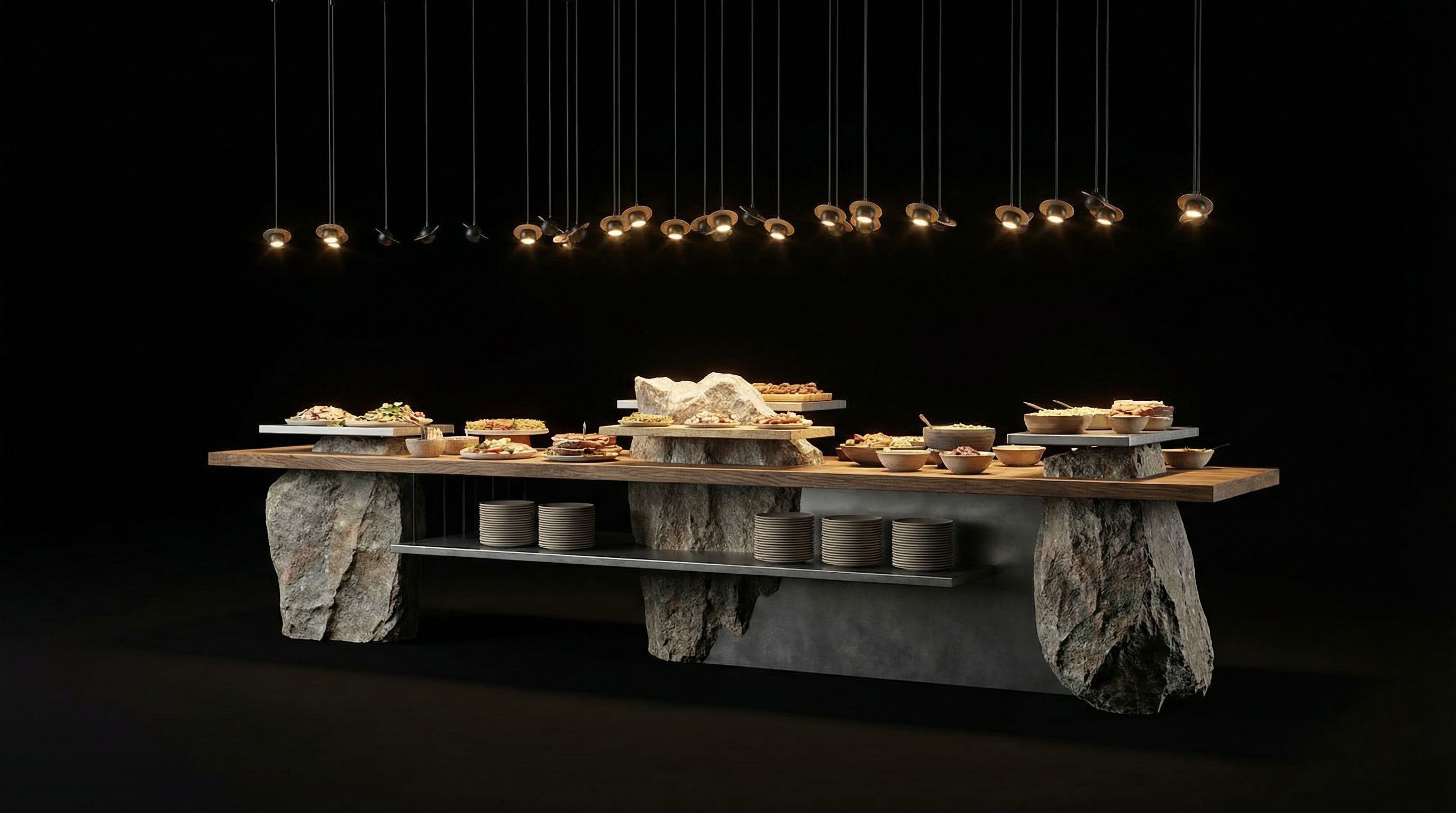 interior design rendering, render this photo into photorealistic rendering, on a pure white or black background, is a kind of table used for presenting the food in restaurants as swedish bufet. is made from stone, wood and metal. above there are lights that have a spot down, keep exact camera angle, high quality, professional, detailed scene