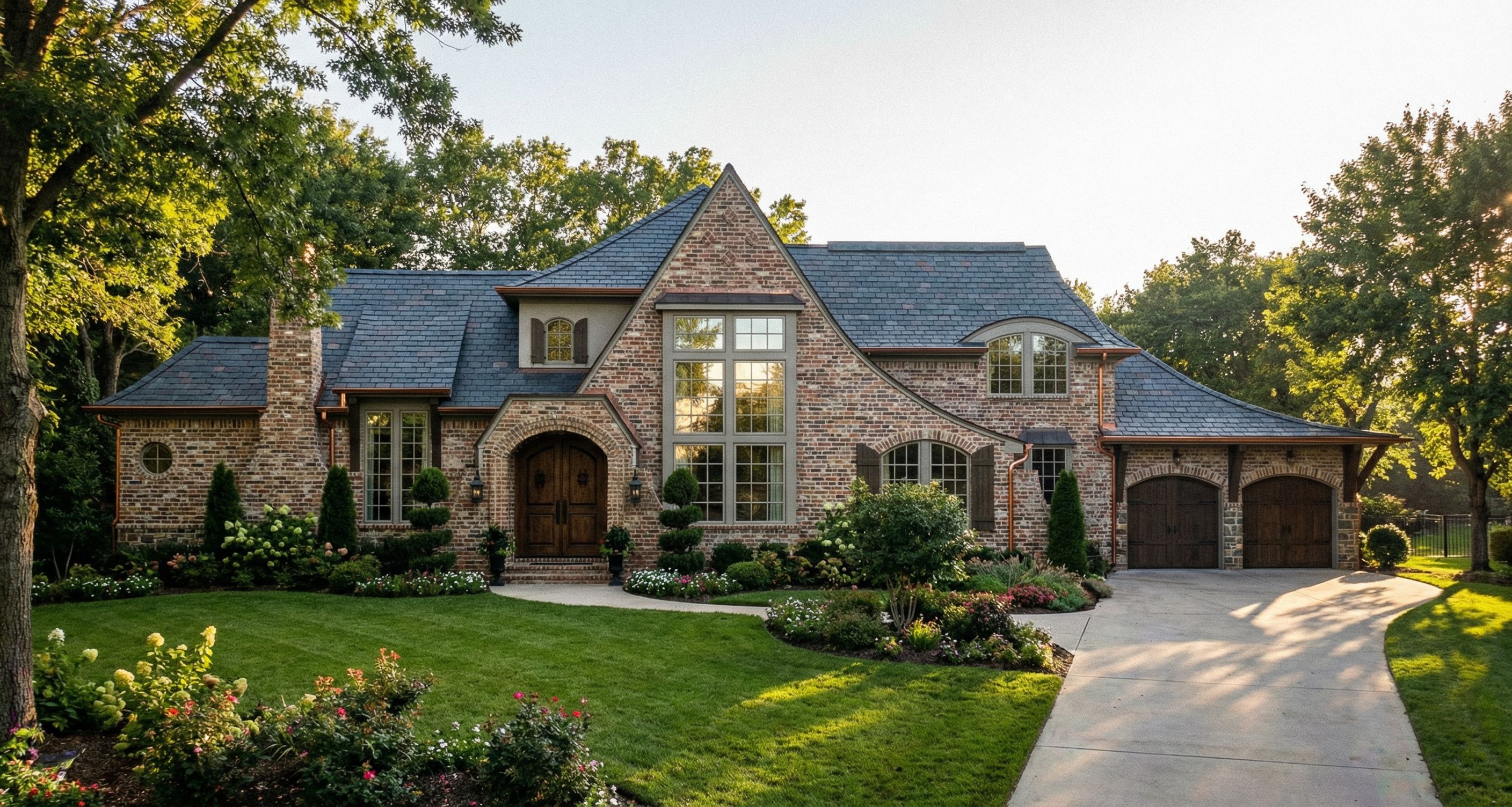 PromptPhoto of a charming residential house, featuring intricate brickwork, large multi-paned windows, and a distinctive steeply pitched roof. Surrounded by landscaped gardens, the entrance showcases a grand arched wooden door flanked by manicured shrubs. Natural lighting filters through nearby trees, casting soft shadows on the facade during late afternoon. Captured from a slightly elevated angle to reveal the front and sides of the building, using a wide-angle lens to emphasize the spacious front yard and create depth in the composition., keep exact camera angle