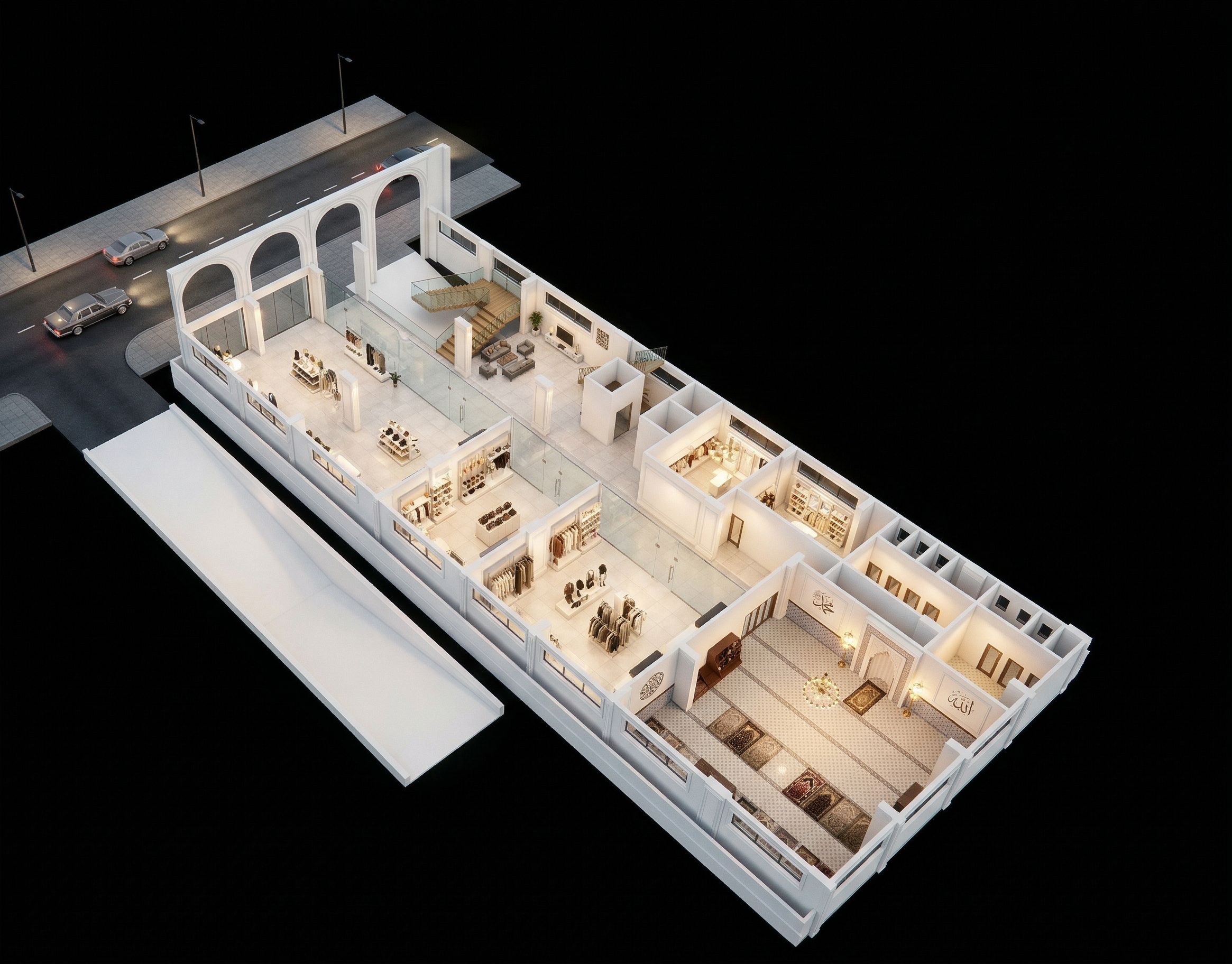 PromptAERIAL VIEW OF A COMMERCIAL LAYOUT WITH LIGHTS TURNED ON IN THE HOUSE. SHOPS AT THE FRONT AND INSIDE. A MOSQUE IN THE BOTTOM RIGHT CORNER. USE GLASS BALUSTRADES ON THE STAIR. FRAMELESS GLASS PARTITIONS IN SHOPS . VEHICULAR RAMP SHOWN IN RED BUT USE WHITE CONCRETE TO BASEMENT GOING BELOW THE STAIRCASE AT THE FRONT. INCLUDE MOULDINGS IN WINDOWS AND OPENINGS. USE BRILLIANT WHITE ON THE WALLS . MAKE THE GLASS CLEAR, REALISTIC AND TRANSPARENT. USE CERAMIC TILES ON FLOOR. MAKE IMAGE BRIGHT HIGH RESOLUTION 8K WITH A BLACK BACKGROUND., keep exact camera angle