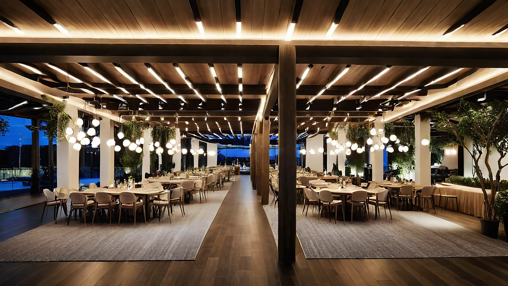 Promptmodern event center, outdoor ceiling lights, woolen carpet on the floor
