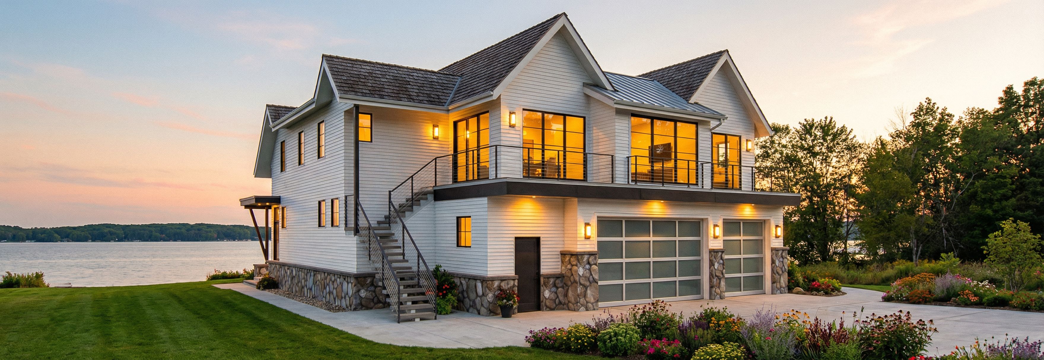 Make photorealistic rendering of the house, add lake view on the left in the background per Reference Image 1, add low density trees on the right behind the house, replace light brown gravel spaces with flower beds, lawn on the left side, darker cedar shake roof, roof between two large gables is standing seam metal, garage doors aluminum as shown, clean bright white mitered lap siding per Reference Image 2, exterior lights on, light in the interior rooms, keep exact camera angle
