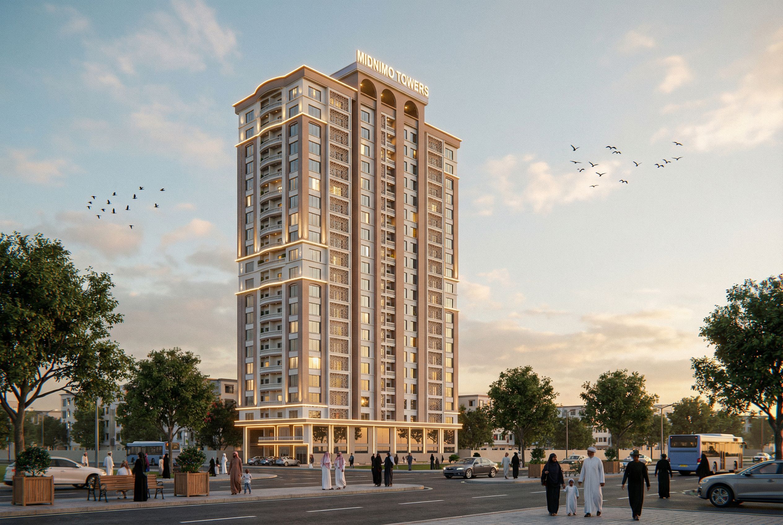 EXTERIOR IMAGE OF A BUILDING WITH GROUND FLOOR AND FIRST FLOOR AS COMMERCIAL FLOORS AND 2ND -20TH FLOORS APARTMENTS. MAKE THE GLASS REALISTIC, CLEAR AND REFLECTIVE. INCLUDE SOME SPOT LIGHTS AND ROPE LIGHTS, STREET LIGHTS IN THE BUILDING. INCLUDE SOME BIRDS IN THE SKY. INCLUDE SOME PEOPLE OF SOMALI ORIGIN IN THE IMAGE. USE WHITE AND PASTEL BROWN COLOUR ON THE BUILDING. PUT THE NAME " MIDNIMO TOWERS" ON THE BUILDING. INCLUDE MOULDINGS ON OPENINGS, WINDOWS AND ARCHES IN THE BUILDING., keep exact camera angle