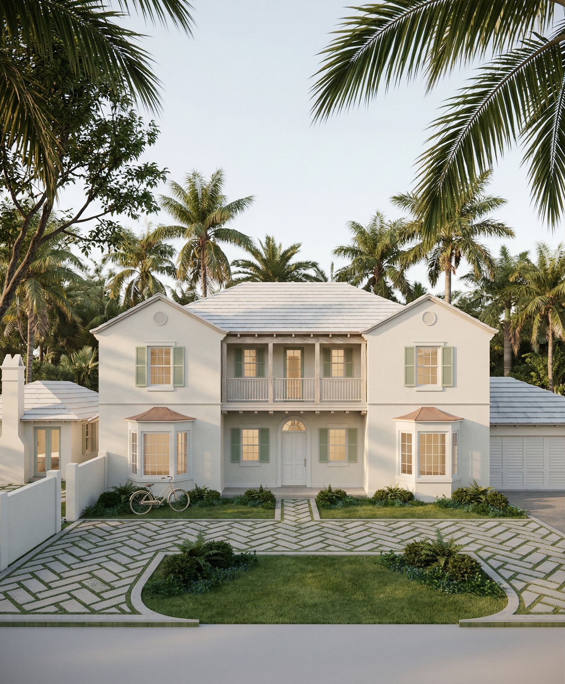 Ultra-photorealistic enhancement of the provided architectural rendering. π¨ ABSOLUTE RULE MOST IMPORTANT Preserve the exact architecture from the input image. Do NOT change: massing proportions roof forms window/door placement balcony design columns or details Do not reinterpret or redesign anything. Only enhance realism. πΈ CAMERA Centered on front door axis Symmetrical composition Slight perspective not flat elevation Eye-level, slightly closer to the house Natural lens 50mm feel Vertical lines perfectly straight π Should feel like: standing in front of the home, not viewing a model π΄ ENVIRONMENT CRITICAL β THIS FIXES THE βFAKEβ LOOK Transform the setting into a real Palm Beach residential environment Add: mature palm trees tropical vegetation layered greenery behind and around the house Introduce foreground framing: palm fronds entering from top edges a tree branch partially overlapping frame Background: soft tree line not empty sky no flat horizon or blank space π House should feel embedded in landscape, not isolated π€ LIGHTING INTIMATE + NATURAL Time: early golden hour Warm, soft, slightly diffused sunlight Gentle shadow variation across faΓ§ade Subtle dappled light like filtered through trees Interior: soft warm glow not visible inside π Avoid dramatic or overly even lighting π§± MATERIALS REALISM β NO PLASTIC LOOK Stucco White Dove: warm off-white matte subtle grain + micro shadowing slight natural irregularity π² WOOD FIX THIS HARD White-washed pecky cypress: pale neutral driftwood tone NO orange, NO yellow visible grain + pecky texture slightly weathered, dry, matte π ROOFING Main roof: white concrete tile soft variation depth between tiles Bay roofs: aged copper muted, slightly patinated not shiny or saturated πͺ DETAILS Windows: white aluminum, subtle reflection Shutters: muted soft green Fresh Dew Doors: painted white wood, satin finish πͺ¨ HARDSCAPE Keep pattern EXACT Add: tonal variation slight wear realistic joints Grass: slightly imperfect not uniform π± LANDSCAPING Keep layout EXACT Refine into: luxury but relaxed Palm Beach planting Add: variation in plant size soft edges slight asymmetry π Avoid overly designed or symmetrical look π‘ LIVED-IN TOUCH VERY SUBTLE Add ONE small element: bicycle leaning OR chair slightly angled OR small object near entry π Should feel: someone just stepped inside π― FINAL GOAL Create: an intimate, high-end residential photograph β not a render It should feel: real grounded warm human NOT: staged perfect or artificial π₯ FINAL CONTROL LINE DO NOT SKIP βMaintain strict architectural fidelity to the input image. If any geometry changes, regenerate. Prioritize realism, natural materials, and environmental integration over stylization.β, keep exact camera angle