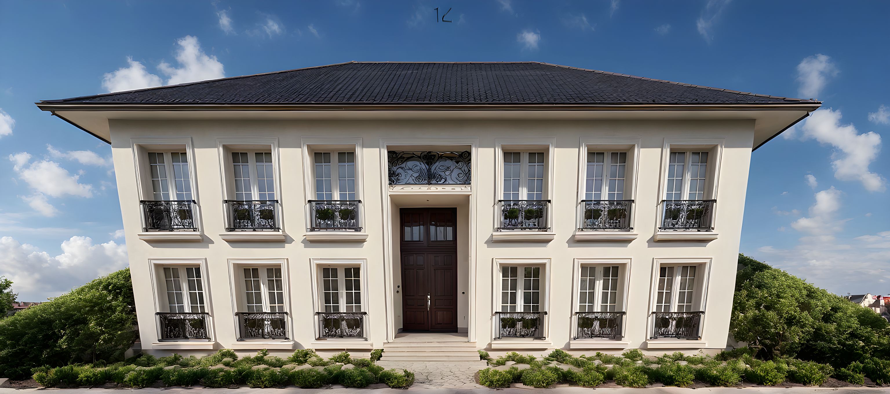 PromptPhoto of a classical residential building featuring a symmetrical façade, adorned with intricate wrought-iron balconies and a prominent central door framed by decorative detailing. The exterior showcases light-hued stucco, contrasting with dark roofing materials under a vibrant blue sky. Positioned in a serene urban landscape, with manicured grass in the foreground and neighboring structures in the background. Soft, natural daylight enhances the architectural features, casting gentle shadows on the surfaces. Captured from a frontal perspective at eye level, emphasizing the grandeur and balance of the design.