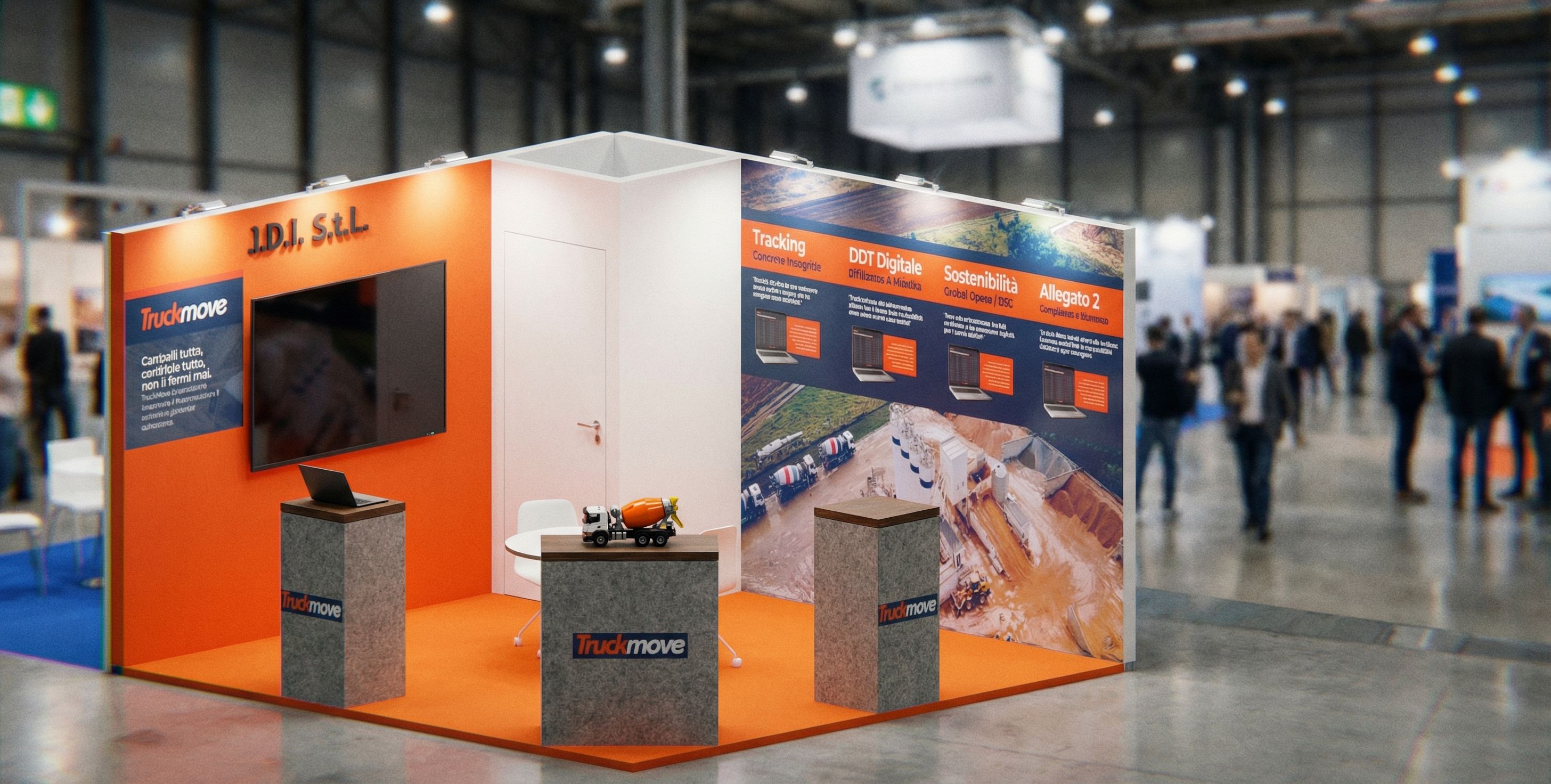 Prompt Genera un render fotorealistico di uno stand fieristico moderno per GIC 2026 partendo da un modello SketchUp esistente. porta bianca dello sgabuzzino i 3 parallelepipedi centrali con materiale Concrete Rock la superfice sopra i parallelepipedi in legno olmo scura e la betoniera giocatolo sopra deve avere il track bianco e nero la botte RAL 2004 leggermente ruvido Il colore RAL 2004 arancione il miscelatore della betoniera il tappeto dello stand la parete grafica TruckMove elementi grafici della parete Il colore arancione deve essere brillante e industriale. ILLUMINAZIONE Illuminazione da stand fieristico professionale: faretti LED da soffitto luce neutra accenti luminosi sulle strutture riflessi realistici sui materiali Atmosfera: stand tecnologico industrial tech ambiente da fiera GIC visitatori sfocati in background non modificare la foto , keep exact camera angle