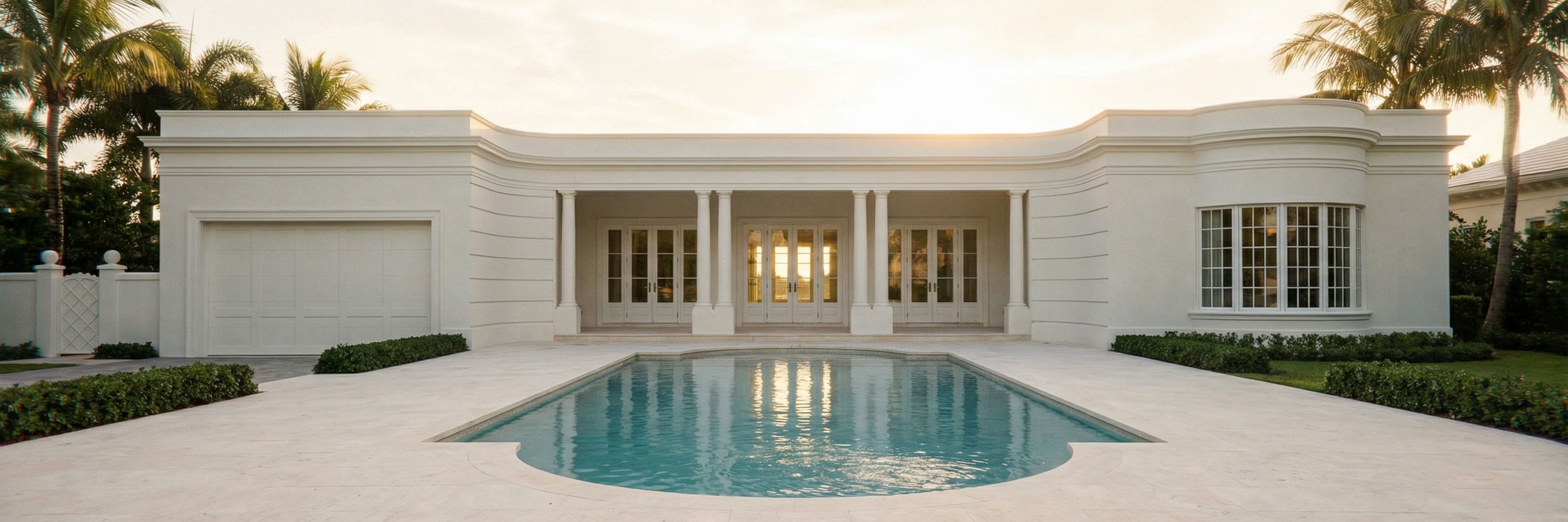 All architectural surfaces are smooth white stucco in a monochromatic Palm Beach Regency palette. Cornices, columns, surrounds, moldings, and entablature are also white plaster with subtle shadow lines emphasizing the classical detailing.