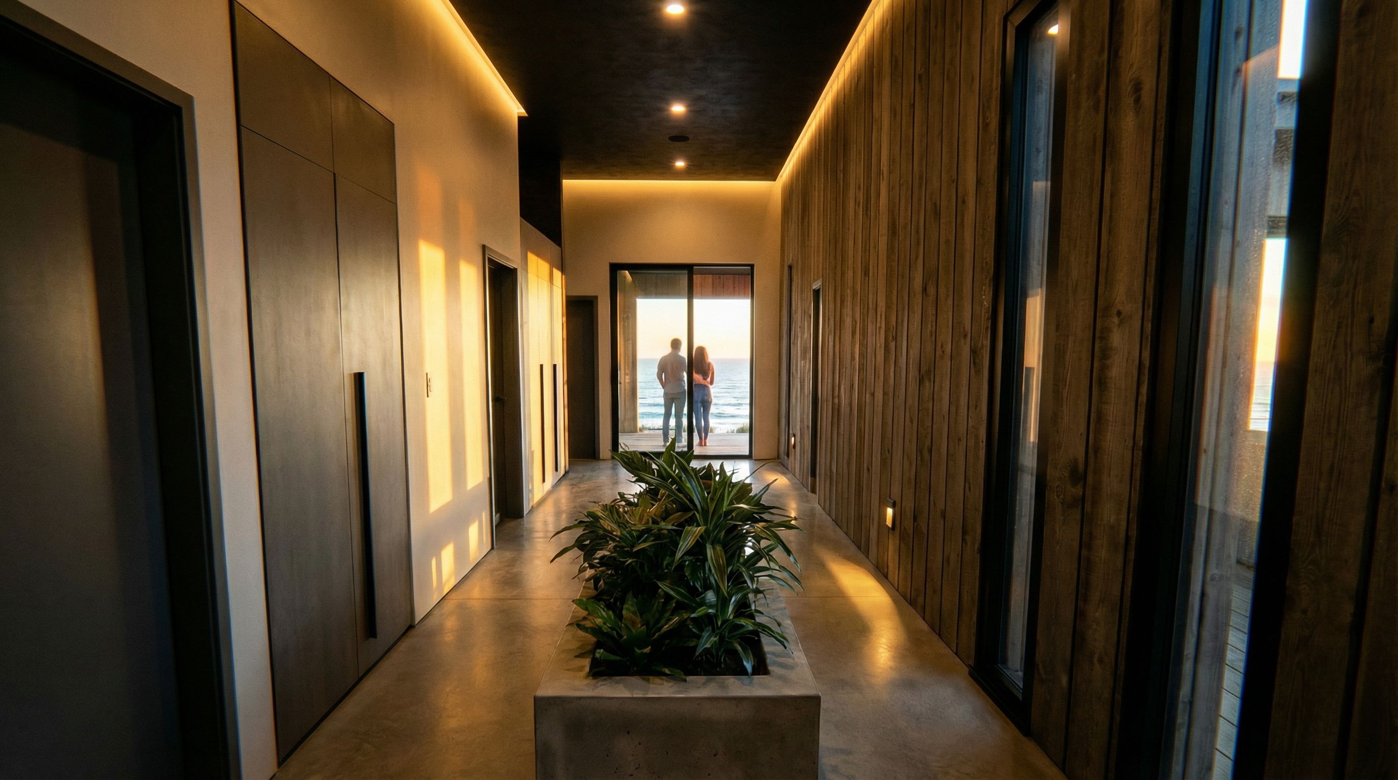 PromptThis is the entrance. its important that you see through to the distant ocean and landscape. Create a nice atmosphere Make more slick, Central plant in hallway Reference image is the view