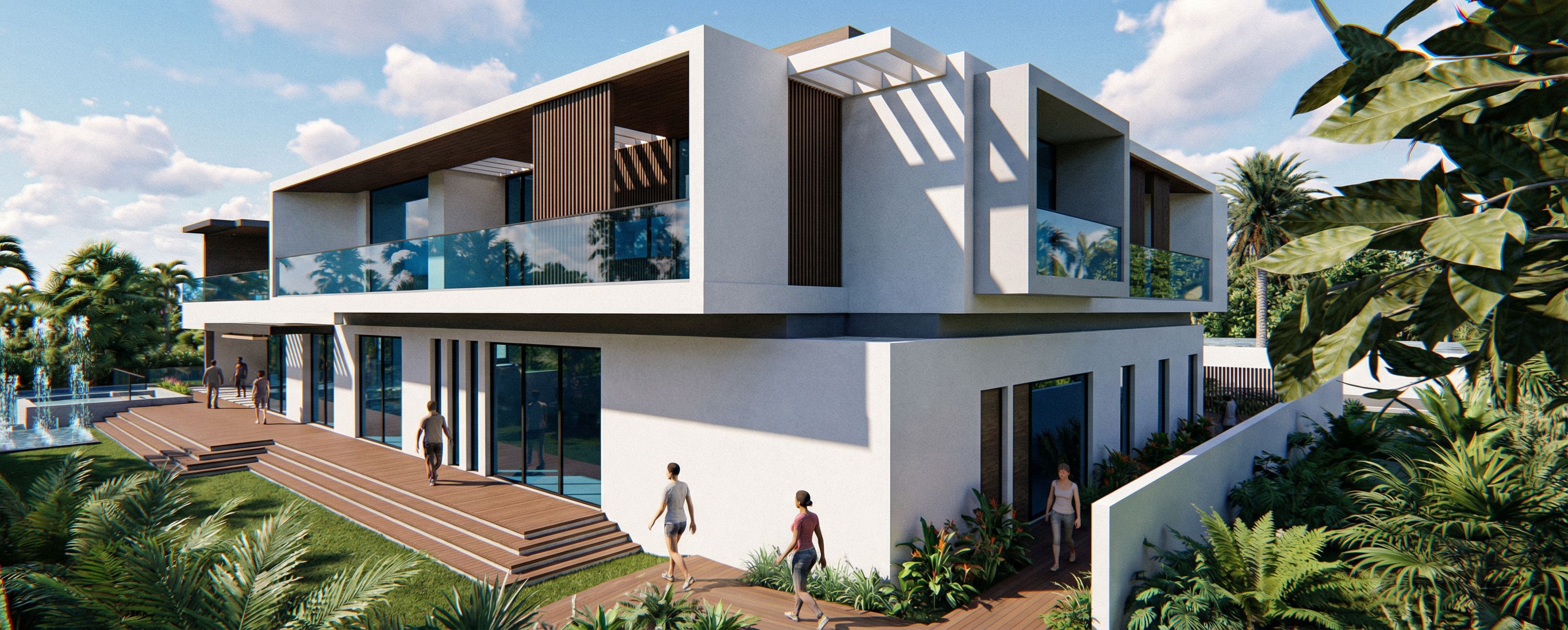 HIPER RELISTIC RENDER. MODERN HOUSE. CLEAR SKY WITH SOME CLOUDS. ADD SOME VEGETATION TIPICAL FORM FLORIDA. ADD SOME HIGH DEFINITION PEOPLE WAKING AROUND. KEEP THE POINT OF VIEW EXACT AS IT IS., keep exact camera angle GLASS OF THE WINDOWS WITH A SEMI DARK BLUE TONE. , keep exact camera angle