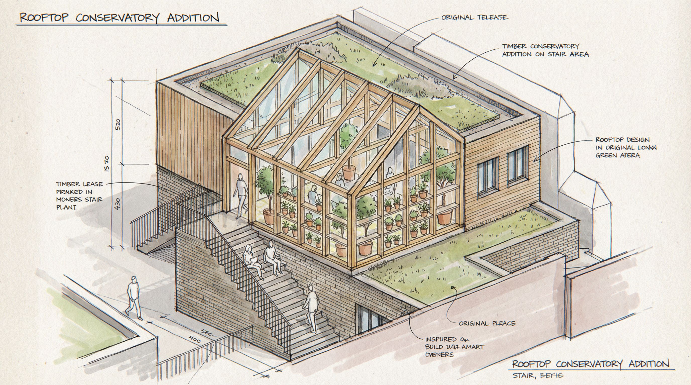 do a sketch of this but add something over the stair area inspired by reference image structure. as a sketch, keep exact camera angle