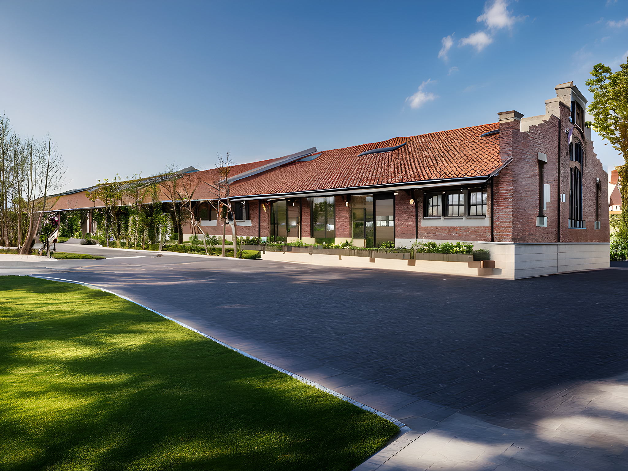 Promptsame facade style, same materials of the construction, terrace, tables and chairs, garden, bikes