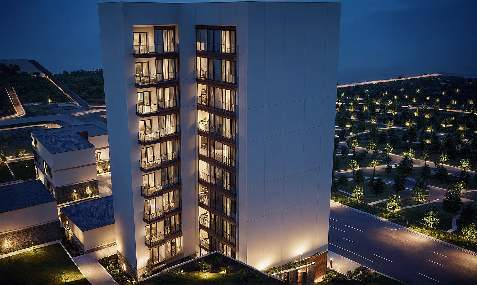 luxury apartments, modern architecture, urban landscape, window T elements, lodges, parking entrance gate, night atmosphere