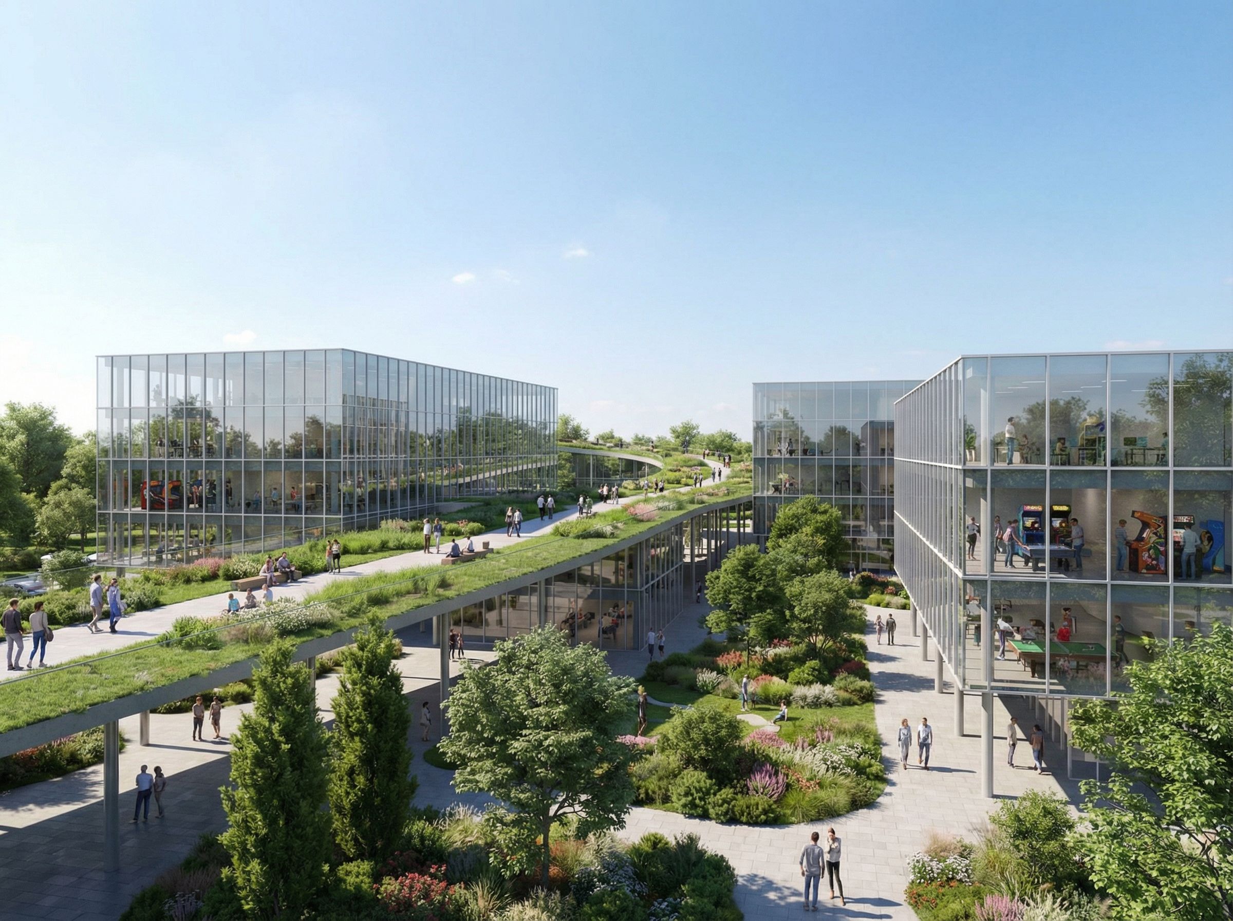 architectural exterior rendering, render this 3D mass into photorealistic rendering, My project is a park. functions are the same material which is double skin glass. The green element is the slope that links all the functions together. There are people on these terraces snd on this slope. And people inside playing games of entertainment. I want it in the same angle as the pic I uploaded. , keep exact camera angle, bright daylight, natural lighting, including people, high quality, professional, detailed scene