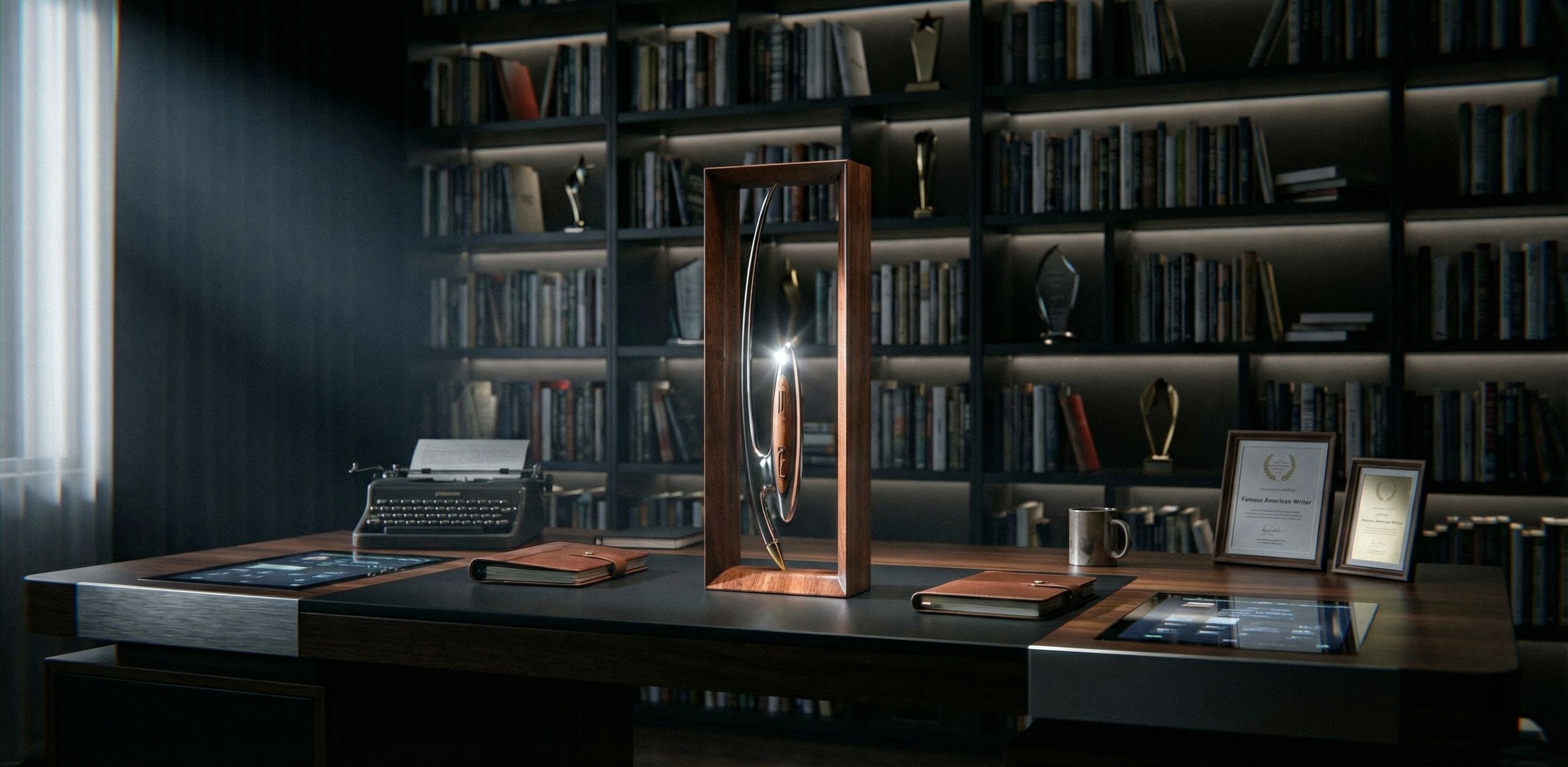 PromptPlace this object on a modern hi tech desk belonging to a famous American writer. Behind the desk is a very modern bookcase and a wall full of books. On the left is a window through which a ray of light enters, illuminating only the pen; the rest of the lighting is dim; the background is dark., keep exact camera angle