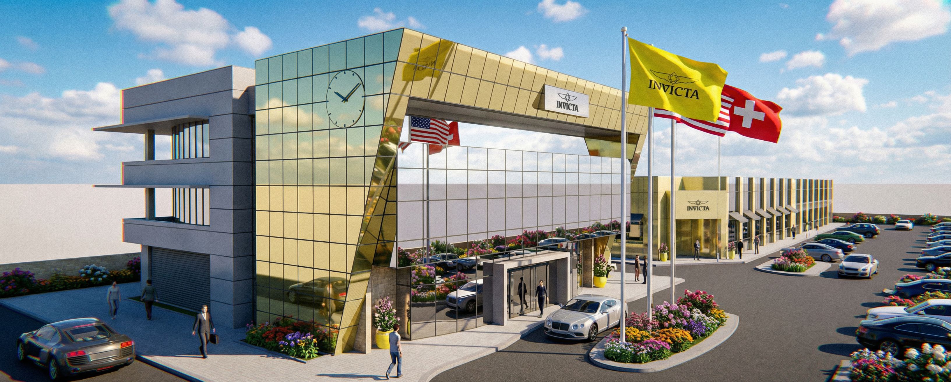 EXTERIOR CON CIELO AZUL Y ALGUNAS NUVES, VEHICULOS ESTACIONADOS , GENTE CAMINANDO, FLORES EN LAS AREAS DE JARDINES. ADEMAS DE LA BANDERA DE INVICTA MOSTRAR LA BANDERA DE ESTADOS UNIDOS Y DE SUIZA, FACHADA DEL EDICIO EN VIDRIO ESPEJO , keep exact camera angle