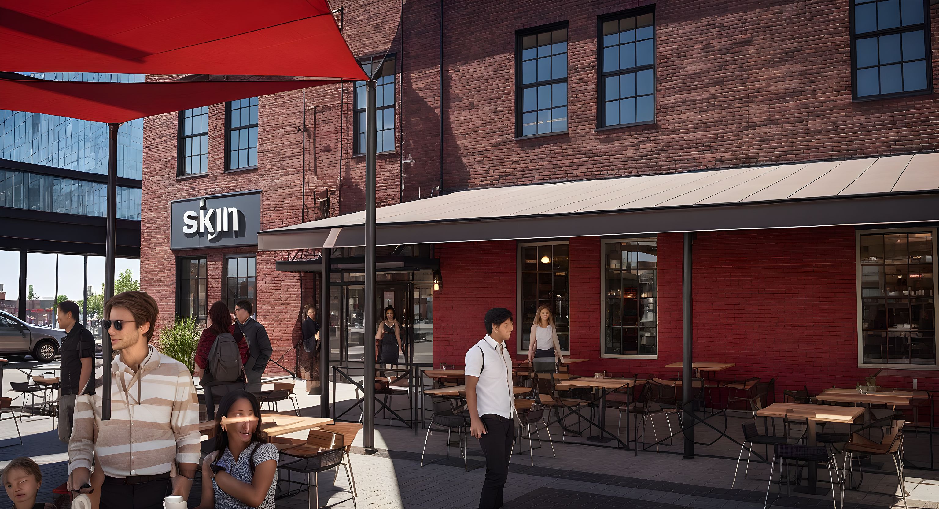 PromptPhoto of a contemporary cafe design featuring a brick facade and modern outdoor seating. Emphasize the textured red brick wall, large windows, and metal awning. Surrounding urban environment includes patrons engaging at tables, captured in a lively public space. Natural light floods the area, creating soft shadows on the pavement. Perspective from a low angle, focusing on the entrance and outdoor seating arrangement, with a wide lens to include the bustling atmosphere. Highlight the interplay between architectural materials and people enjoying the urban landscape. Shade sails red triangles top of rendering