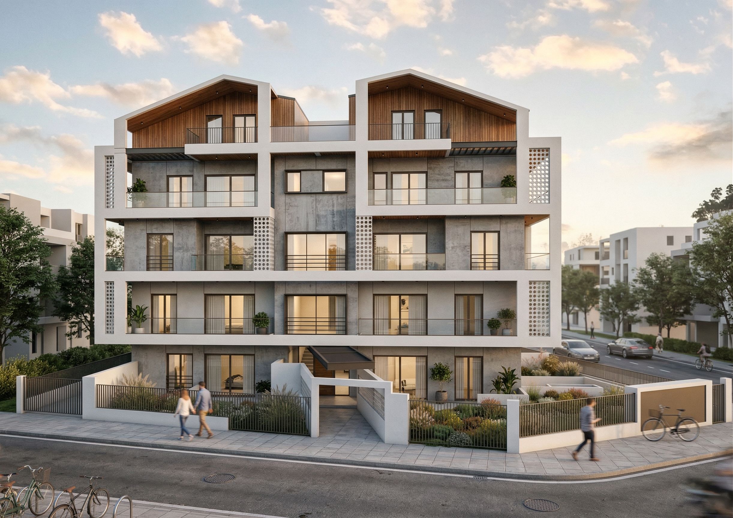 PromptPhoto of a modern apartment building showcasing clean lines and geometric forms, featuring textured concrete façades, expansive glass windows, and wooden accents on the pitched roofs. Set in a contemporary urban environment, surrounded by minimalistic structures and landscaped pathways. Soft diffused natural lighting illuminates the exterior during late afternoon, casting gentle shadows. Captured from a slightly elevated angle to emphasize the building's height and architectural details, with a wide-angle lens to encapsulate the surroundings and create a dynamic sense of space., keep exact camera angle