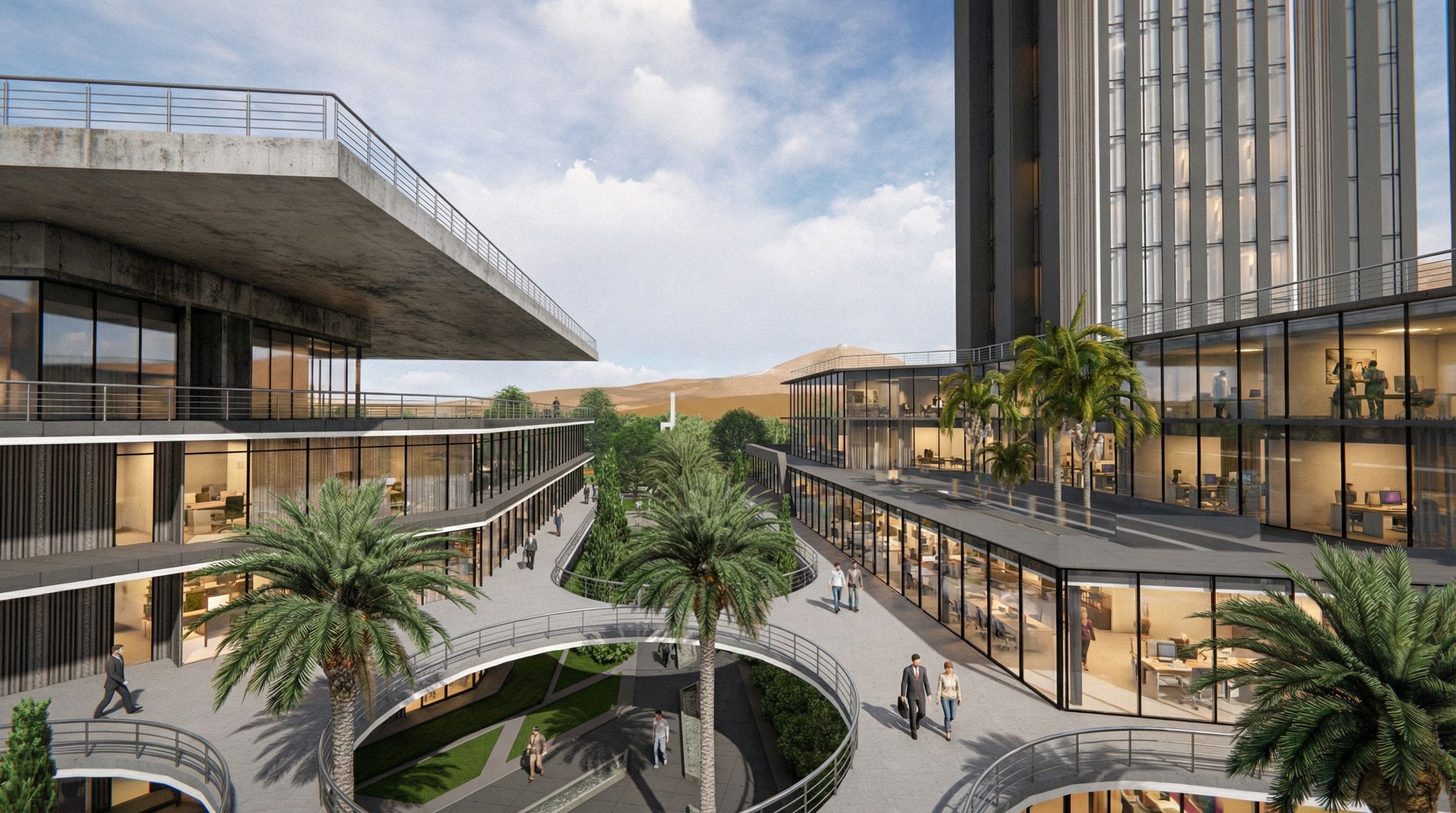 PromptTHIS IS A SCENE IN A BUISNESS CENTER .. MAKE THE ENTIRE SCENE REALISTIC AND ALIVE .. ADD PEOPLE ,, ADD LIGHTS ,, ADD HANDRAILS UP ENHANCE THE MATERIALS DON'T CHANGE THE CAMERA ANGLE ADD HANDRAILS FOR THE SLAB AROUND THE PALM TREES , keep exact camera angle