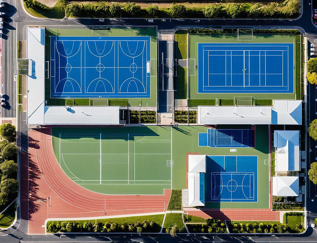 Photo of a modern sports complex with expansive multipurpose fields of tennis, basketball, netball and an Olympic swimming area. Emphasize sleek lines, large glass facades, and durable materials such as concrete and steel. for the small clubhouse. The setting features surrounding urban parkland with pathways and nearby structures. Natural daylight floods the interior, casting intricate shadows across the courts. Camera angle showcases an aerial perspective, capturing the building’s layout comprehensively, using a wide-angle lens to enhance the spatial dynamics. The prompt invites a high-quality render with lifelike qualities and attention to detail.