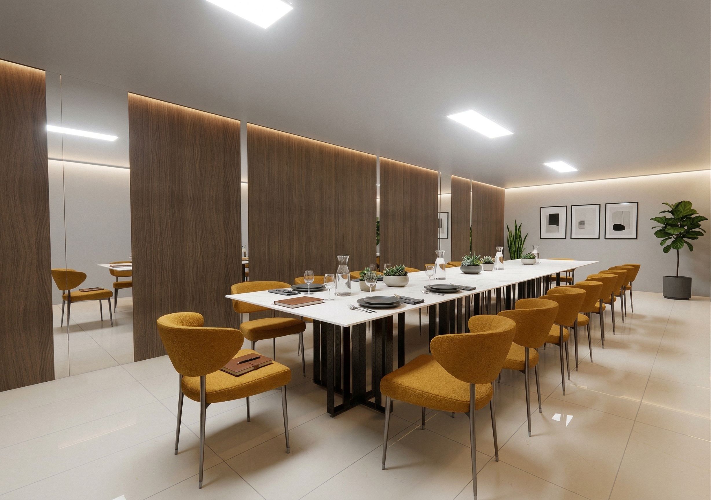 PromptAñade un poco de decoración ya que es comedor de una oficina y hazla más realista! No modifiques ningún material , keep exact camera angle