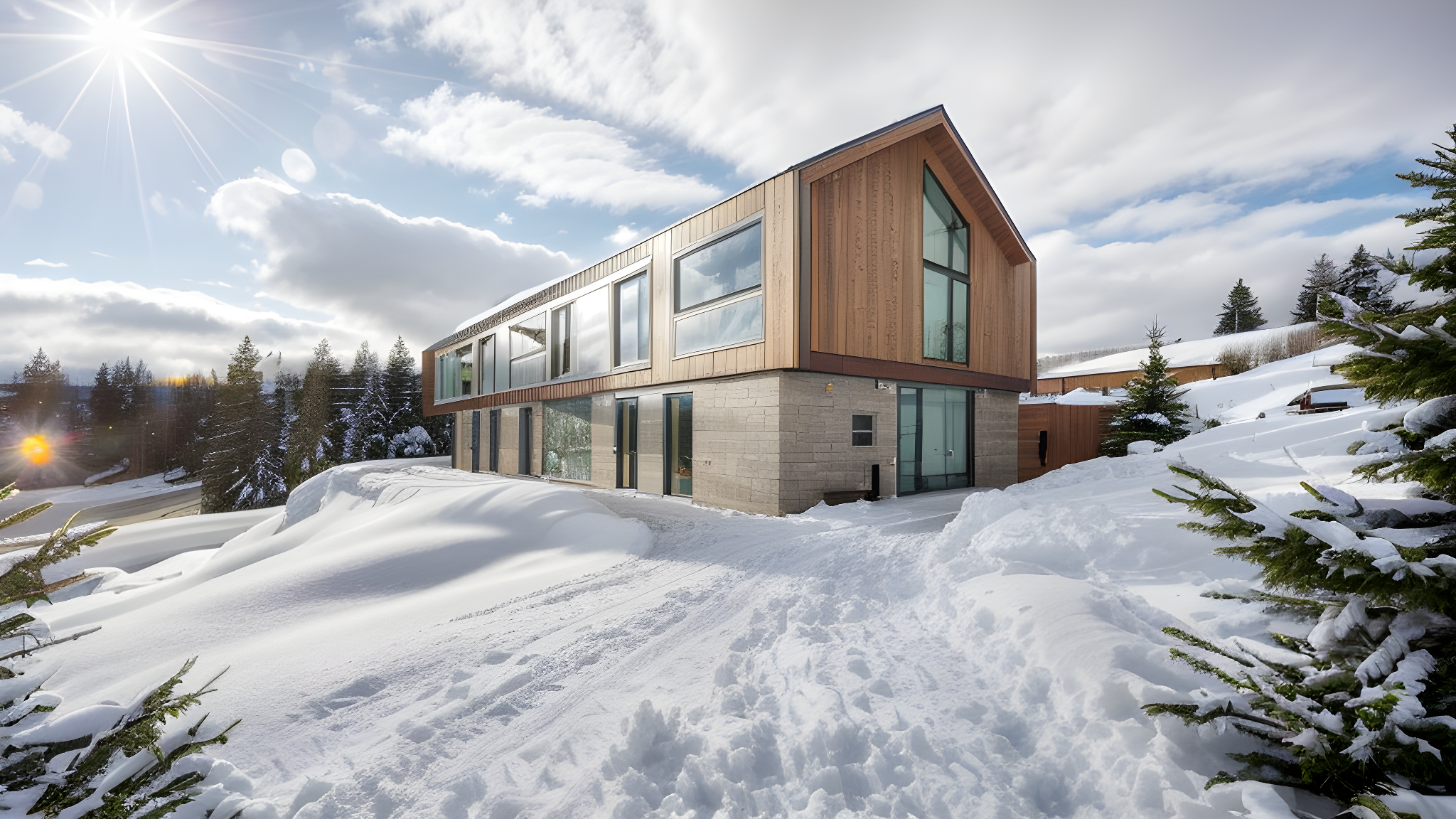 Promptsnowy landscape, mountains, spruce forest, sun, afternoon, snow, flakes